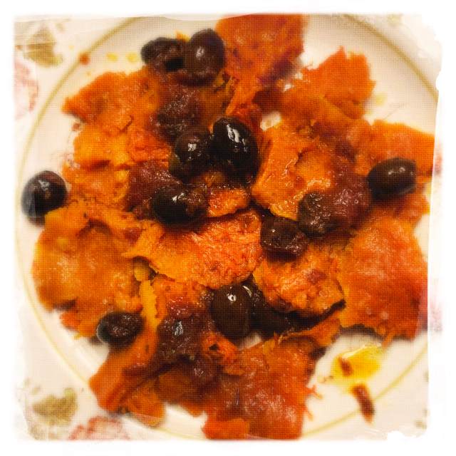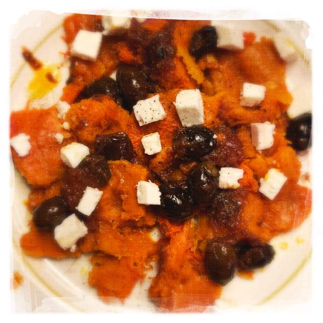I was enjoying the wine so much, I looked around for another excuse to drink some more. The “leftovers” drawer in the refrigerator produced a very small Honeynut Winter Squash from Small Farm. Barbara had split and roasted it ten days earlier, so I decided to see if it was any good. A small mouthful tasted fine, so I peeled it, warmed it up with olive oil, salt, and small cubes of feta cheese. Adding some of the tomato spread and black olives from the sauce, I tasted the dish. Wow!! Off the charts, delicious. I was only sad that we had tried only one tiny Honeynut. I could have eaten a very large one happily.
