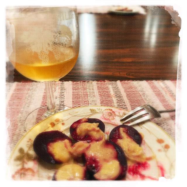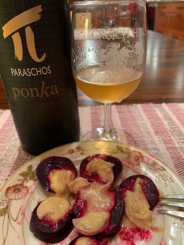 I also decided to do some experimentation with the Small Farm beets I bought on Saturday. I steamed them until tender, then peeled and cooled them, while I read The Flavor Bible, with an eye toward complementary ingredients that might offer variety from the usual feta cheese and similar accompaniments. I settled on three key ingredients that I always enjoy (lemons, Dijon mustard, and sliced shallots). I juiced 1/2 lemon, add the grated zest to the bowl, mixed in 2 tsp. of Dijon mustard, and added on small shallot, thinly-sliced. After whisking these all together, I poured the dressing over sliced beets, adding some delicious, crunchy Ibiza sea salt, and we ate these as an appetizer. This was paired with an orange wine from Friuli, and the balance of flavors were most beneficent.
