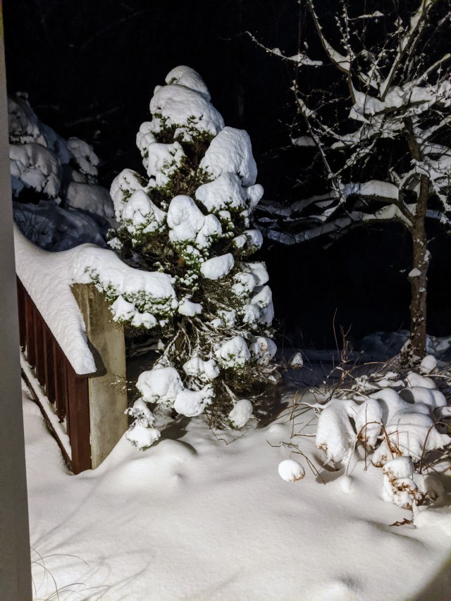 Like much of the country as we begin December, we got a hefty chunk of snow the past few days. Through Sunday evening, Monday, and Tuesday, the total accumulation here was about 12″ of fairly wet snow. With significant changes to our logistics plans, I picked up my former student (who was our guest speaker in class for Monday) on Sunday night. Instead of driving 1.5-2 hours to our house for dinner and overnight, we stayed in town Sunday night and were able to avoid another 2 hour trip Monday morning to school.