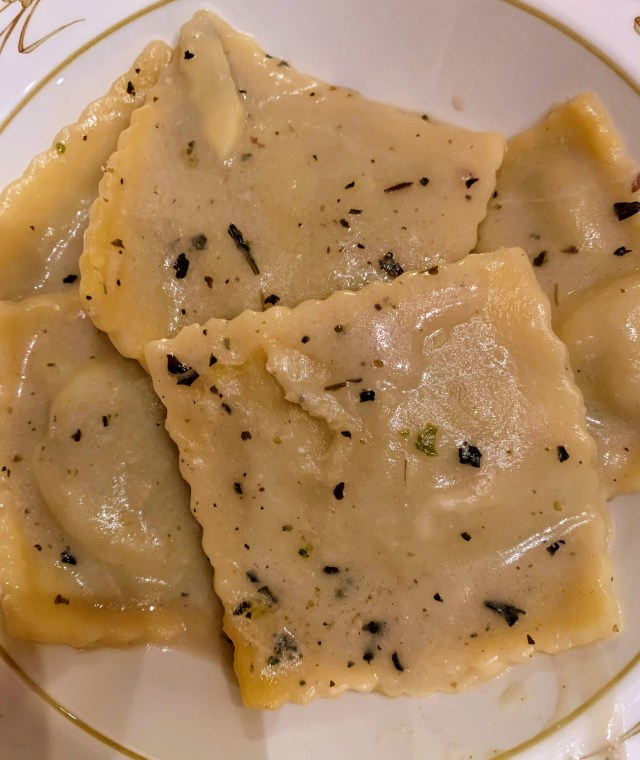 Tuesday was my night to cook dinner. I took the easy route: main dish was a package of Kite Hill Mushroom Ravioli with Almond Milk Ricotta. We had a bunch of Peruvian asparagus, and Barbara had the idea of making the dish with chopped egg, diced cornichons, and sautéed shallots. That turned out to be quick and relatively easy. Barbara had some flavorful leftover vegan bechamel from a gigantic Lasagna she made a few nights ago, so I used that for the sauce (with a little lemon juice added) for the ravioli.