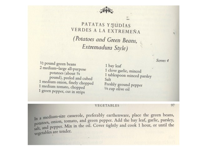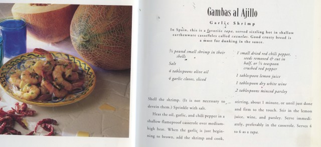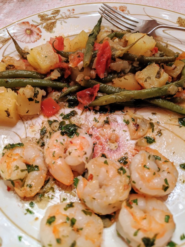 If you love tapas, as I do, you must have encountered this ubiquitous shrimp and garlic dish at some point. Known usually as Gambas al Ajillo, it is a wonderful first course or accompaniment to almost any meal. Tonight we made a quick journey to Spain for supper, starting with the Gambas, and making the rest of the meal from an outrageously simple vegetable dish of Potatoes and Green Beans Extremadura Style. Here’s how they looked on the plate: