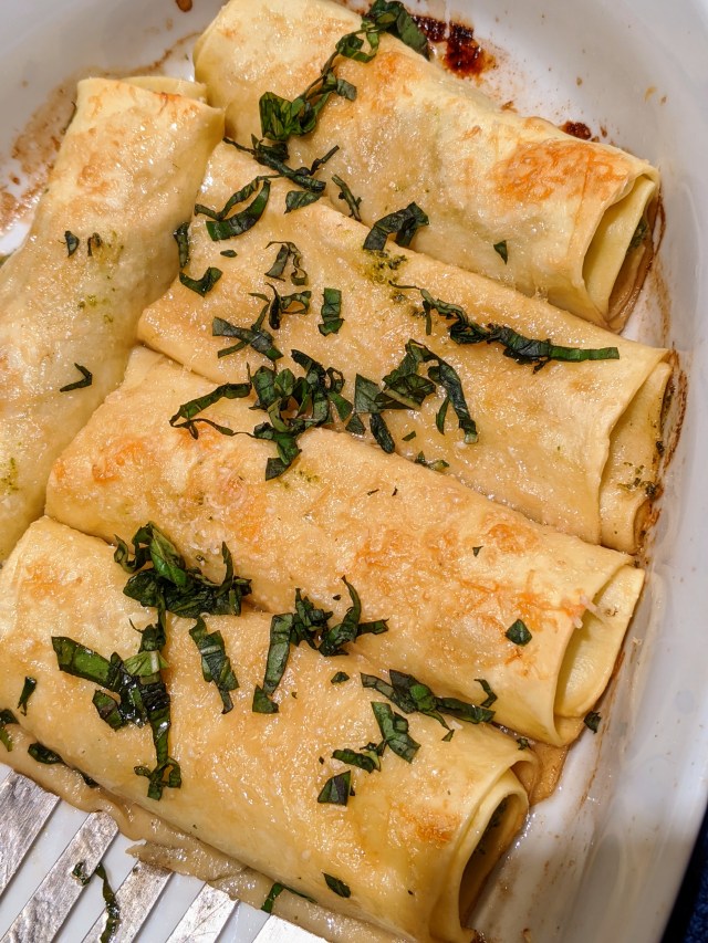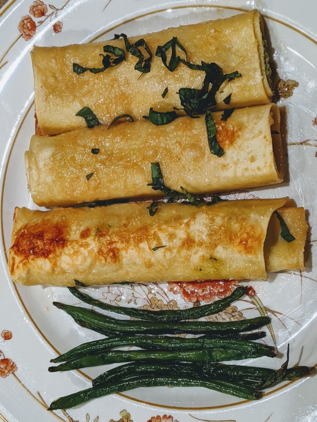 I love when I have time alone to experiment in the kitchen. Yesterday, I made dinner — Baked Cannelloni with Spinach/Swiss Chard/Almond Milk Ricotta Cheese Filling. With just 190 grams of double-zero flour and two eggs, I was able to have 11 sheets of pasta (each about 4″ x 6″) to turn into Cannelloni (similar to an earlier post). Served with reheated green beans, it was a delicious meal for the two of us.