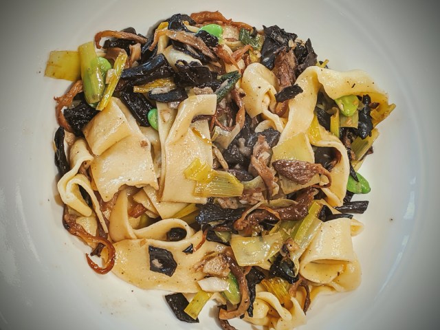 In addition, the process of cutting the pasta sheets to size left me with some odd-shaped trimmings for later use. Roughly approximating wide noodles, they were a perfect palette for the wild mushrooms I needed to use today — black trumpets and oyster mushrooms.