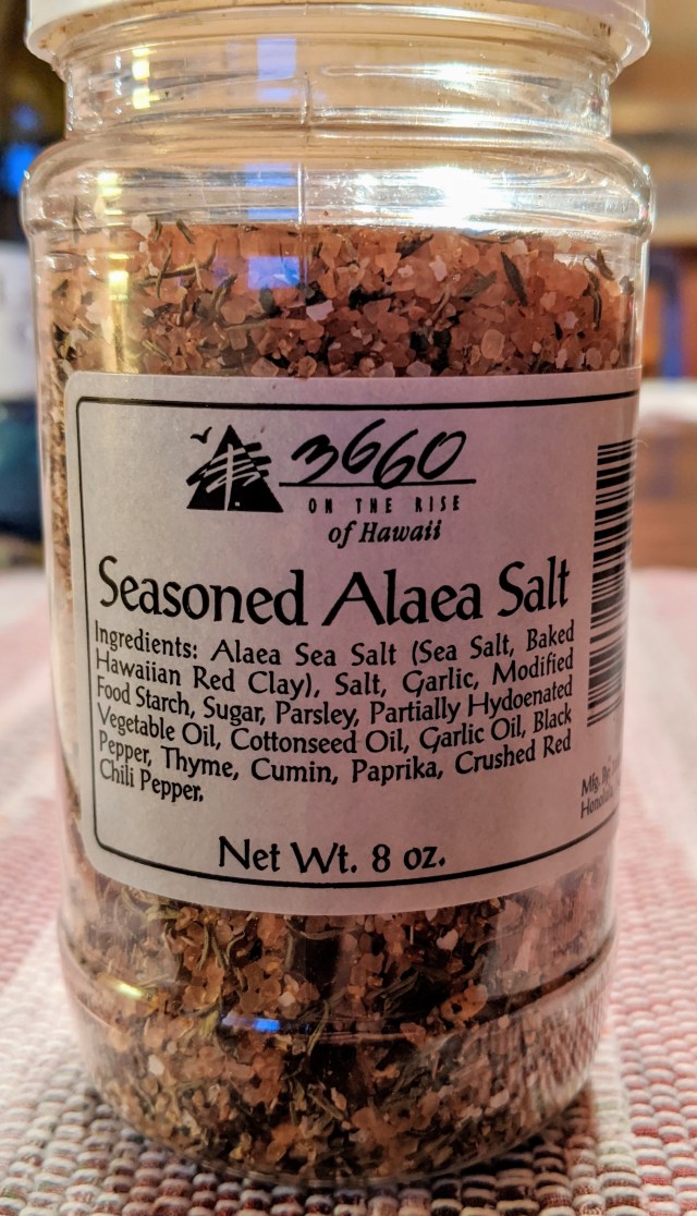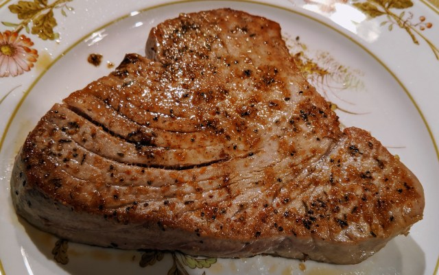 The main event was a lovely steak of sushi-grade tuna, from Idylwilde, our local greengrocer and much more. This was done very simply, sprinkled with olive oil and Hawaiian Alaea Sea Salt (thank you, Hank!), and seared in a very hot cast iron skillet.