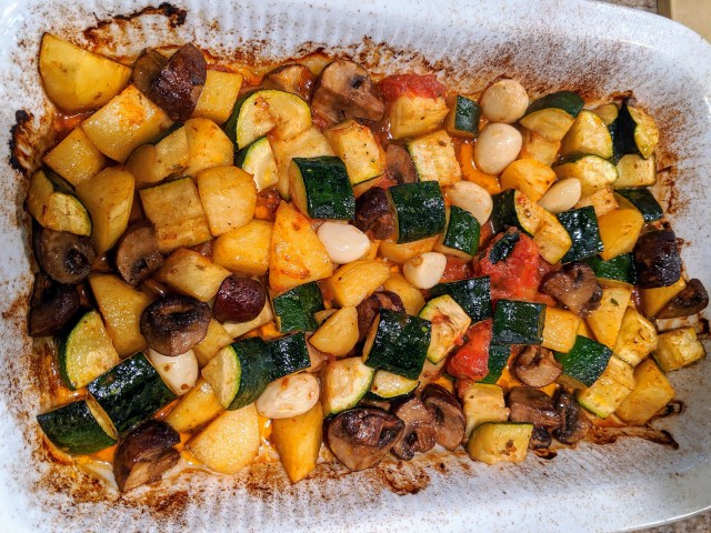 The main accompaniment was a dish of oven-roasted Italian vegetables, compliments of a new (to me) blog, The Mediterranean Dish, and her recipe.
