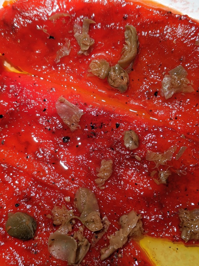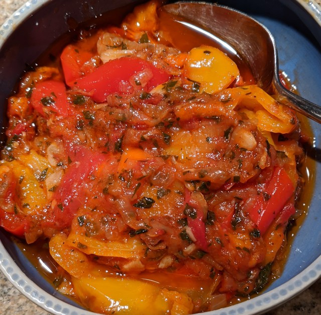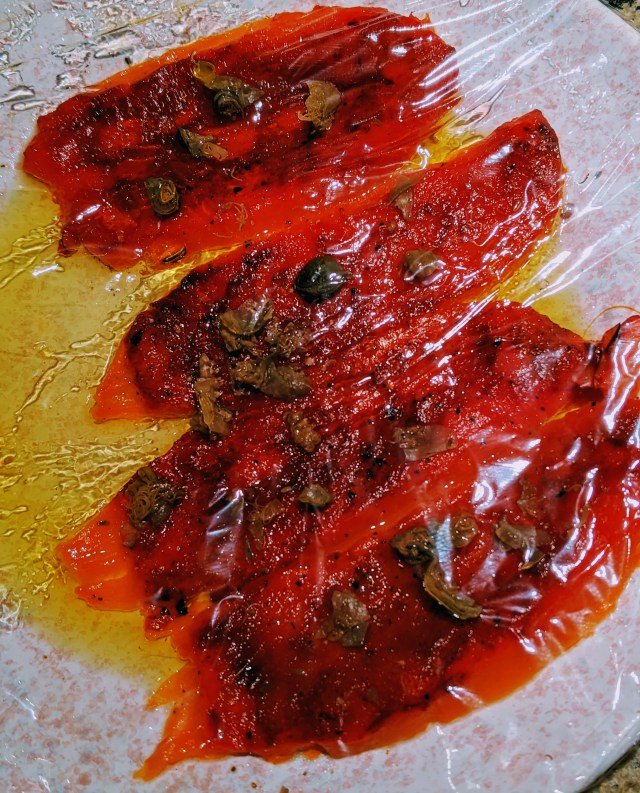 As side dishes just for me (Barbara does not eat peppers), I roasted on the gas grill and peeled one pepper, and I cooked three other colorful bell peppers in a sauté, Puglia-style, with onions, garlic, a little tomato, and chopped parsley. The roasted pepper was topped with Santorini capers and olive oil. Now, I am set with Bruschetta toppings for several days ahead.