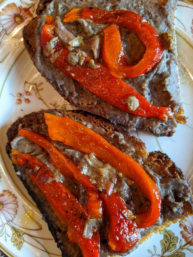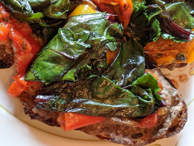 The next used the last two slices of the Field Blend #2 bread I baked earlier in the month. They were first toasted with olive oil in a pan, then covered with bean pureée, and finally topped with the roasted peppers/tomato mixture and sautéed beet greens.