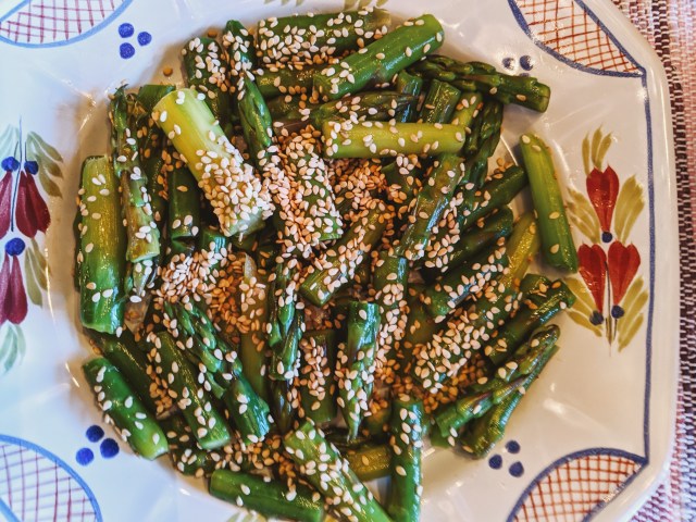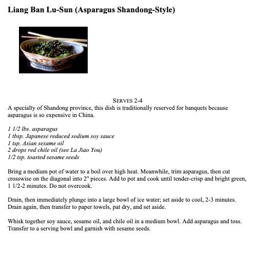 The most recent lunch was today’s. It played on another recent theme, i.e. Bok Choy and Asian cooking. I made two small dishes: (1) Asparagus Shandong-Style and (2) Baby Bok Choy Stir-Fry with Onion, Orange Pepper, Daikon Radish, and Sesame Seeds.