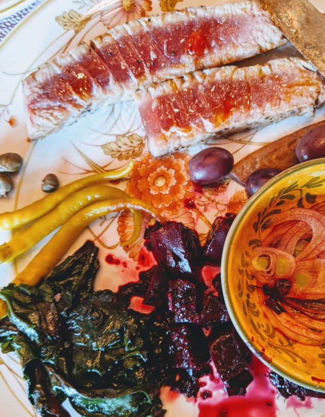 so I had several variations for lunches this week. The first included a bit of the leftover tuna and associated pickled peppers and beets, plus bruschetta with heirloom Moro bean pureée, roasted peppers, and savory capers from Santorini.