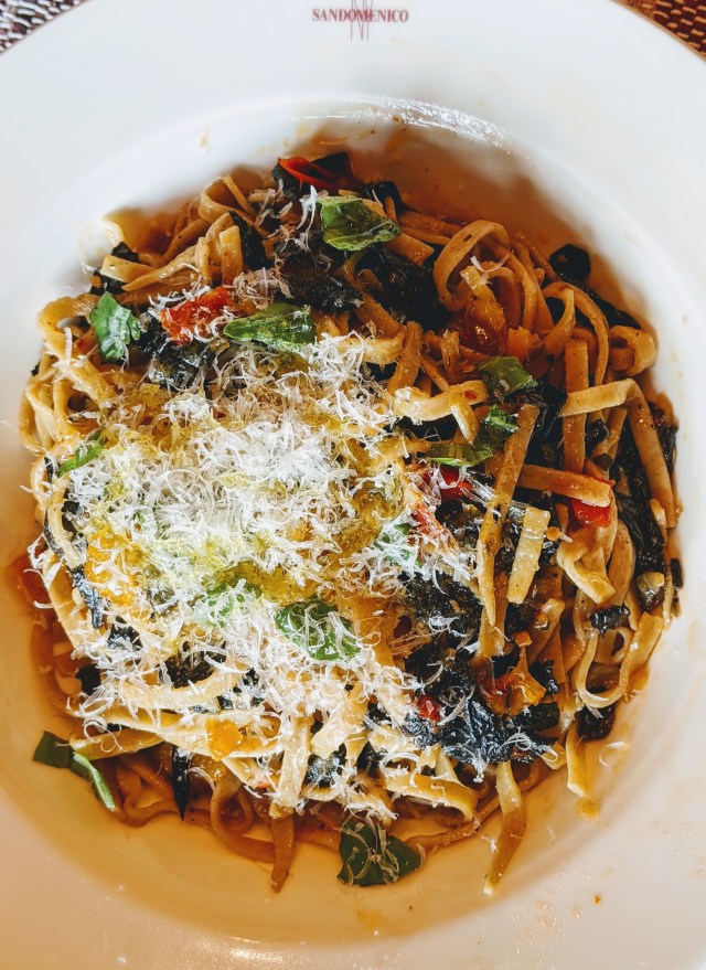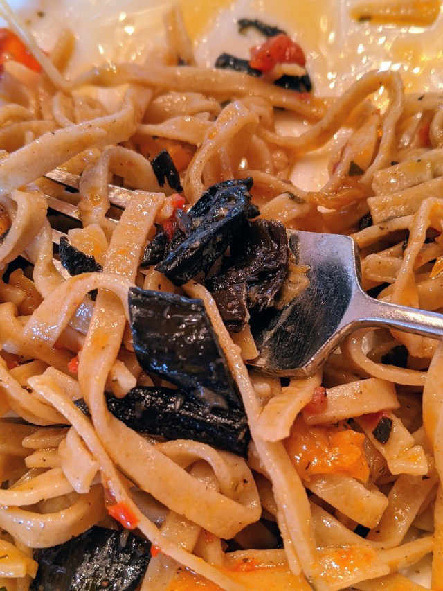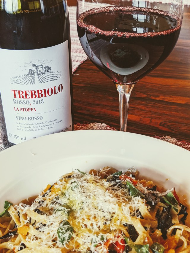 The finished dish was excellent. It was delicious and brightly colored (off-white pasta and black mushrooms, with orange and red peppers, golden olive oil, and flecks of green basil), especially when paired with a 2018 Trebbiolo Rosso, La Stoppa, a robust Barbera/Bonarda blend from Emilia. Tidbits do the job!