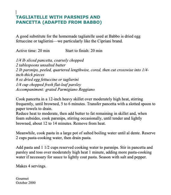 I have been using a recipe of these proportions: 100 g. of flour, one extra large egg, salt, and some olive oil. The results have been excellent using about 2/3 double-zero white flour and 1/3 whole wheat flour (especially organic heirloom Turkey Red brand, purchased from Breadtopia online). Normally, I double the recipe for the two of us. The 100 g. version is too little, and the 200 g. version is too much, so we normally have leftover tagliatelle. I let the remaining pasta dry on the counter overnight, and then refrigerated it, so it was ready for lunch today. That was Tidbit #1.