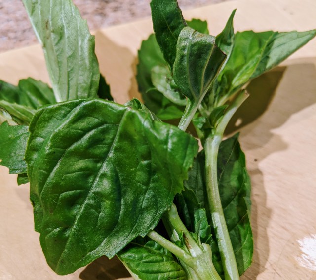The last element to add was simply a few torn fresh basil leaves. This should not be a big deal, if you have it. However, Barbara started her morning by making some fixings for pizza Saturday night. Her first item was Pesto. Normally, she would use the whole package of basil, but since I don’t eat pesto as much as she does, I asked her to save me one stalk from the package. She grumbled, but did reserve it for me — Tidbit #3.