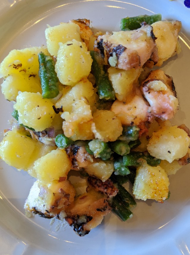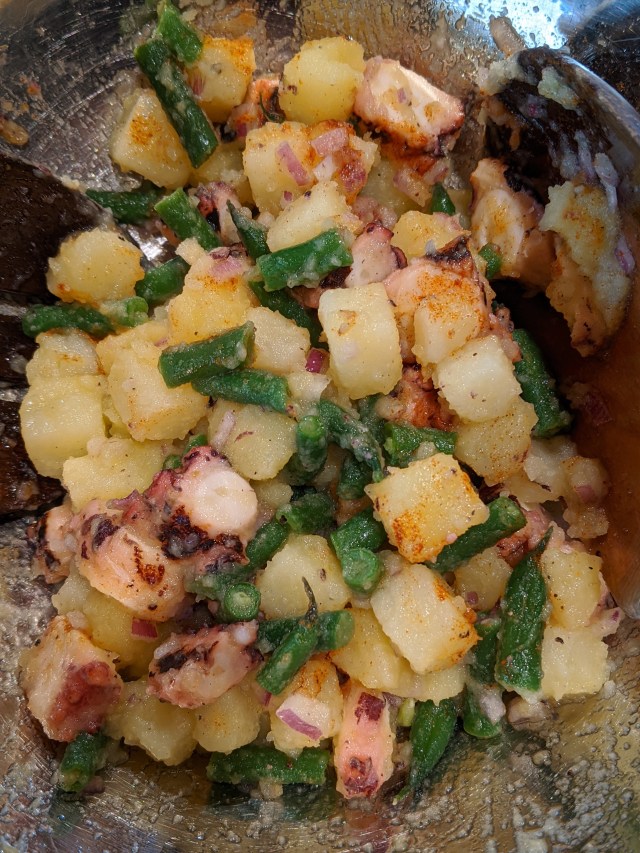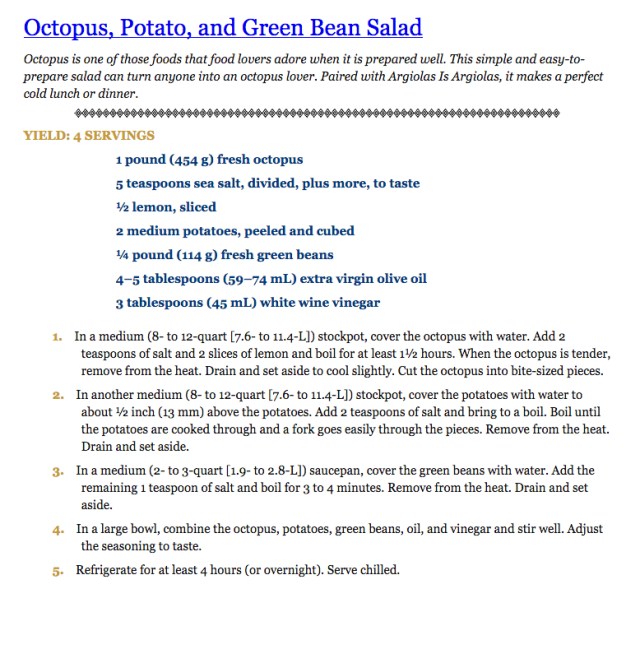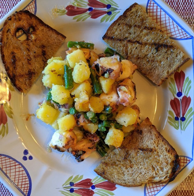 Of all the ways I cook and eat this mollusk, my favorite technique usually involves grilling. I used the basic idea of the recipe above, after having used my gas grill on two tentacles, before I incorporated the slices into the salad. Two other modifications: lemon juice instead of white wine vinegar, and served still warm, rather than the cold salad as described. (I did chill the leftovers, so I’ll sample that tomorrow.)
