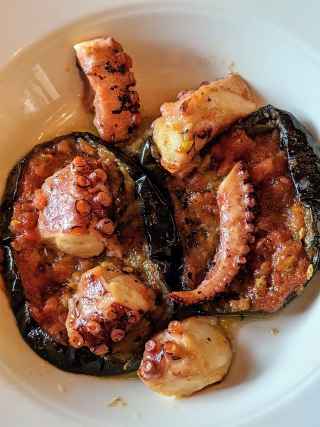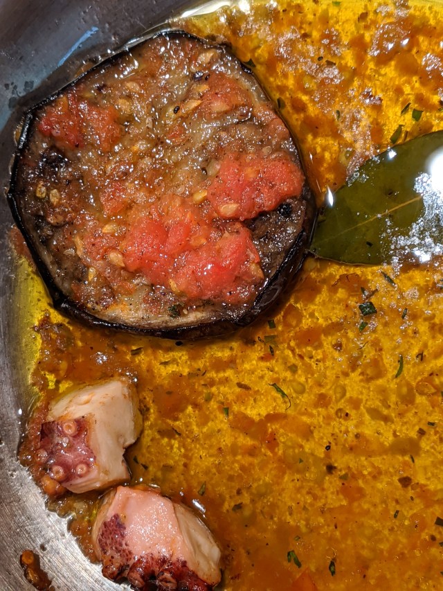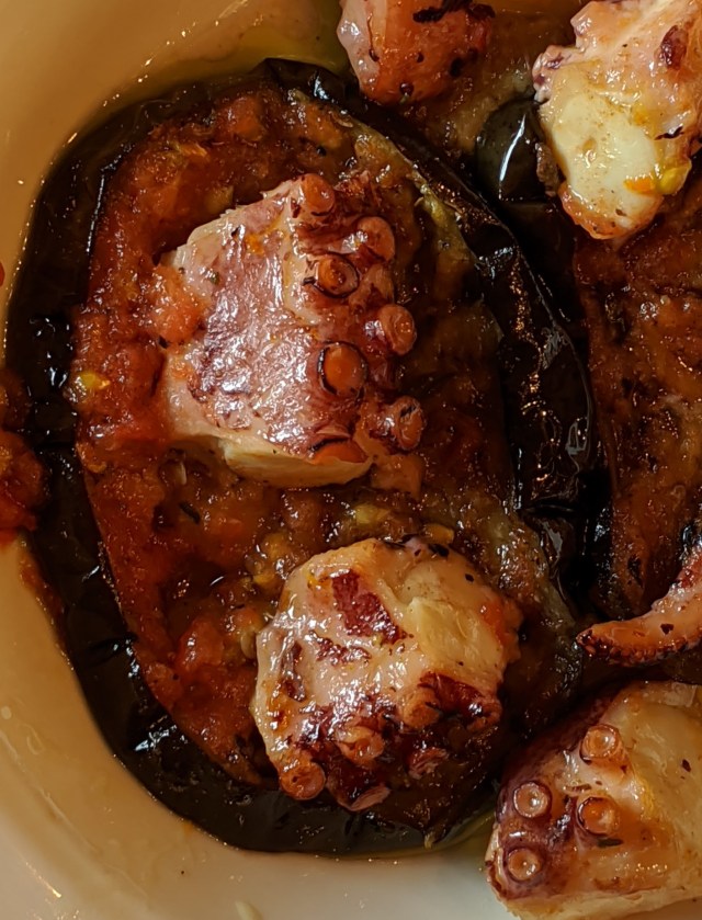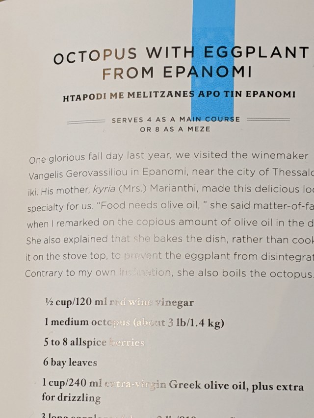 This recipe is from The Country Cooking of Greece, by Diane Kochilas. She describes a dish of Octopus with Eggplant from Epanomi, near Thessaloniki. I won’t give the full recipe because I already had cooked the octopus, so I’ll just give you the essence of the final dish.
