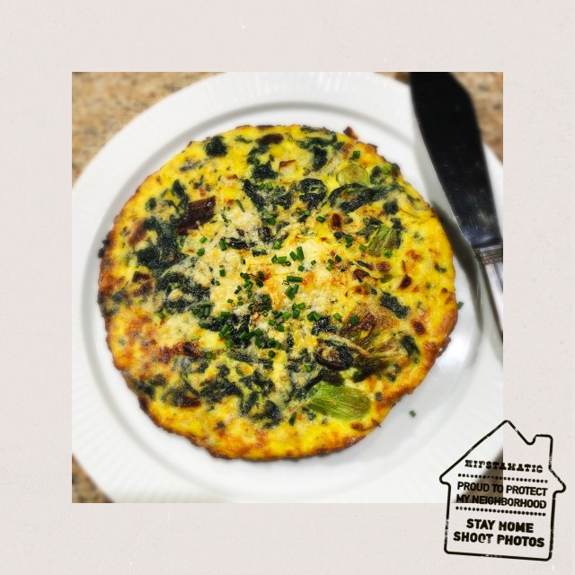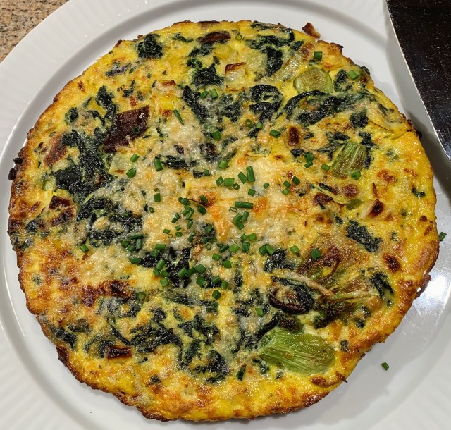 Remove the pan from the oven, let cool a bit, then slide the frittata onto a large plate. Cut and serve with your wine of preference, white or red. In my case I chose a glass of Chicca, the Passerina by Pantaleone, which we had earlier in the week.