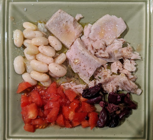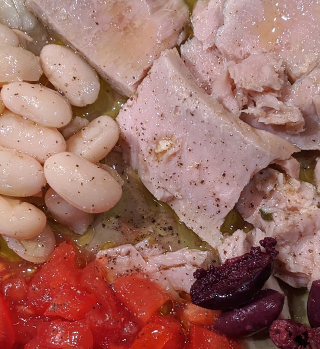 We do get hungry after walking. Leftovers are usually readily available, and they can be configured quickly into a good lunch. On this day I made a simple dish of tuna conserva, cannellini beans cooked the day before, a little chopped leftover tomato, and chopped and pitted Gaeta olives. What really makes a composed salad like this come together in an authentic Mediterranean way is the quality ingredients for dressing: premium Greek olive oil from Kalamata olives, a splash of good Portuguese red wine vinegar, a few pinches of sea salt from Ibiza, and a few cubes of Israeli Feta cheese from Trader Joe’s.