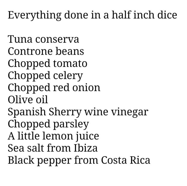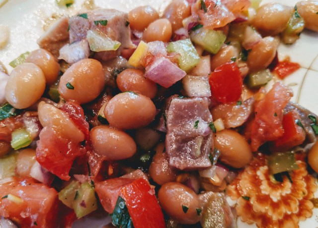 At the same time, I had been thinking about making a traditional Mediterranean tuna salad with the Tuna Conserva made a few days earlier. To that end, I had taken some older dried white beans (Controne) and cooked them yesterday. That was a task in itself. Normally, dried beans which have been soaked overnight will get cooked the next day in 60-90 minutes. These were old enough to need more than 3 hours, but they were safely in the refrigerator, ready to use this morning. I had a small piece of Tuna Conserva (about 1/3 lb.), so it was easy to assemble the salad, once I chose the ingredients and cut everything into 1/2″ dice.