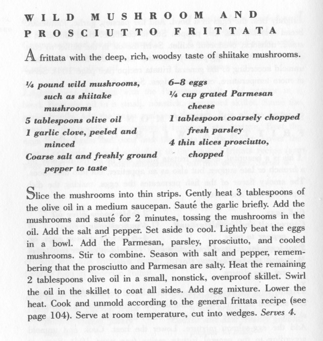 We have some Prosciutto I got delivered from Formaggio Kitchen in Cambridge recently. It is sliced a little too thick for my taste as an antipasto, but it works well when cut into thin slivers in cooking (as I did last night in a side dish of sautéed spinach with garlic). A quick search in my Italian cookbooks produced this recipe for a Wild Mushroom Frittata with Prosciutto, so that was my choice for lunch dish (using just 5 eggs).