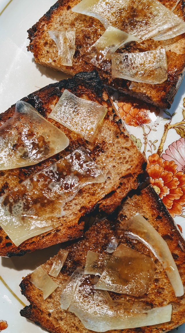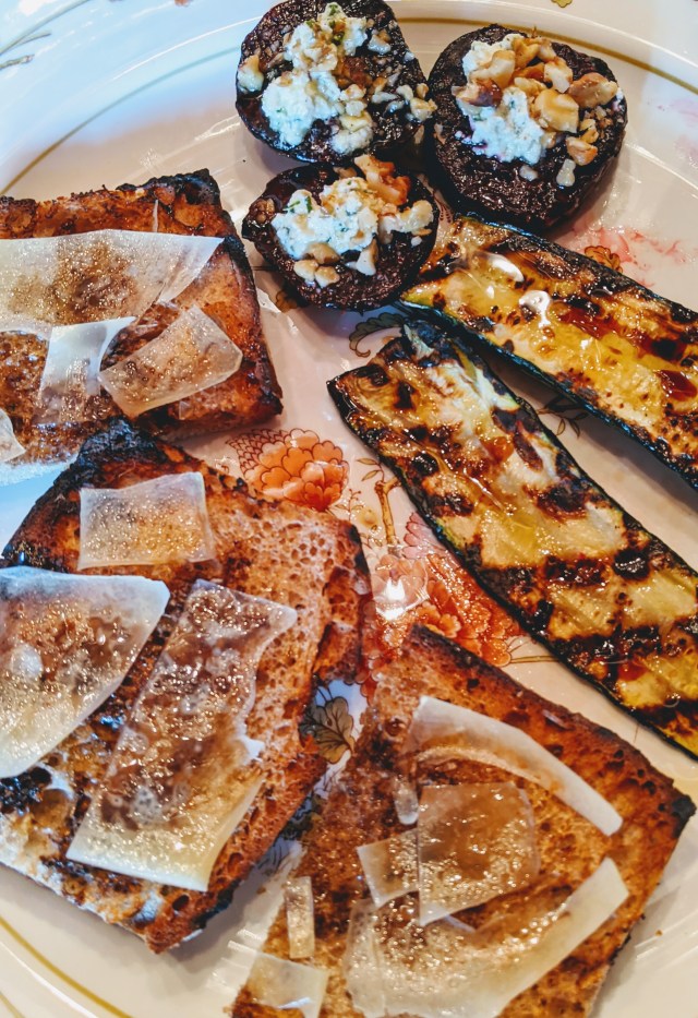 That part was easy, but — as always when I start cooking — complications arose. One was my need to attend to two small cooked beets that were about to expire. In fact, the weird white spots growing on their surfaces made me worry that they already had. I washed and wiped them off vigorously, and I smelled them carefully. There were no further indications of decay, so I proceeded. Since the grill was heating up for the bruschetta, I sliced the beets vertically, added olive oil and Alaea Sea Salt from Hawaii, and seared them on both sides. The next step turned out to be a huge success. I topped each beet slice with the whipped feta cheese I’ve been putting on everything I can, plus some toasted chopped walnuts, leftover from the recent fresh pasta dish. Magnifique!