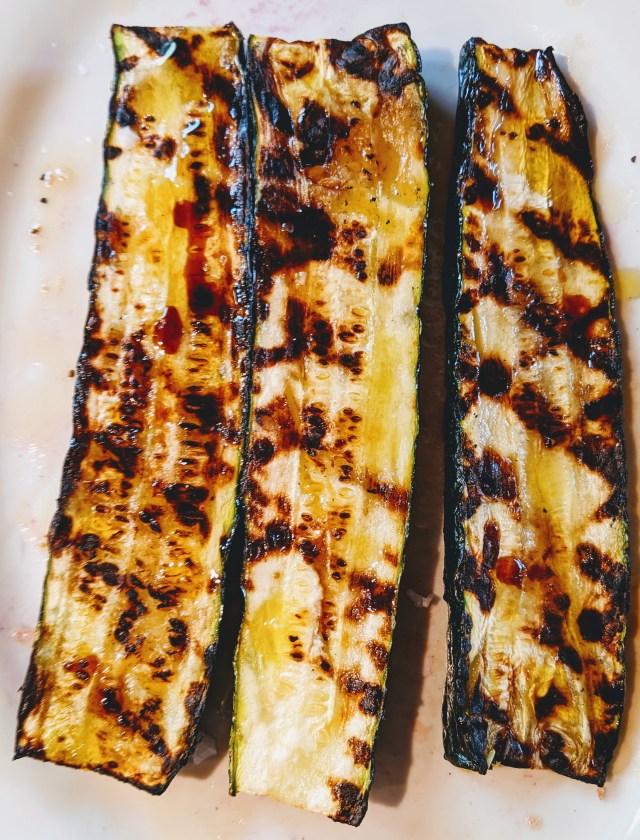 The other addition was some grilled zucchini, since I needed to use an older one, as Barbara was putting three new ones in the refrigerator this afternoon. Three lengthwise slices gave me the right thickness for grilling, and olive oil and balsamic vinegar provided the flavor enhancers. Antipasto for one, just to my specifications.