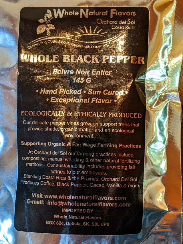 Several years ago my brother and his partner were in Costa Rica for fun and education, and they brought me back a small package of organic peppercorns from Orchard del Sol. They were the most fragrant and balanced peppers we ever encountered. Carole and Joanne, the ladies who run this little business live in Saskatchewan, Canada, and they work with growers in Costa Rica. It’s a big contribution to sustainability, a tribute to the global economy, and it has made us happy and healthy for years.