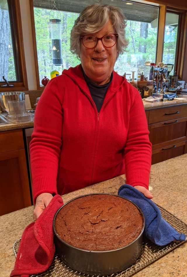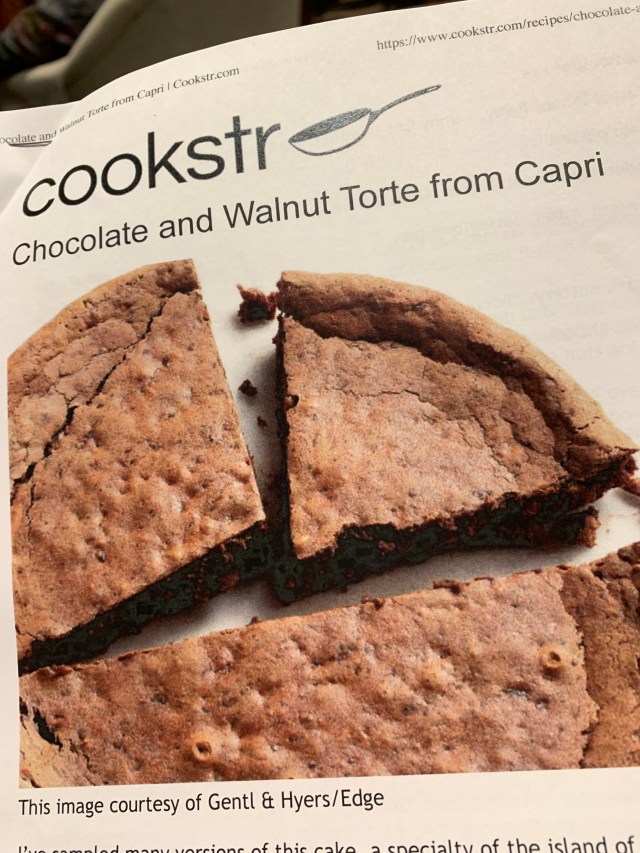 That night Barbara did her thing beautifully. I have been looking for ways to enjoy our recent wealth of organic walnuts, so I researched walnut tortes of various kinds. Several looked attractive, but when I consulted with her, the verdict was clear — it would be a chocolate walnut torte, popular traditionally from Capri, the isle off the coast of Naples. The walnuts and I were very happy with the results.