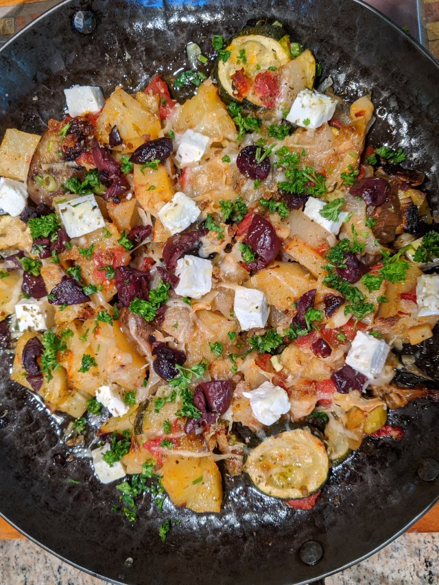 The next day, however, I made a much-improved version with the leftovers. I preheated a heavy, hammered steel pan, and then added a little olive oil, the leftover baked vegetables, some cubes of feta cheese, dried homemade whole wheat breadcrumbs, and chopped Kalamata olives. With the broiler on high (and watched carefully to prevent burning), it became a crispy, flavorful rendition. I enjoyed it with a glass of 2018 Corte Gardoni Bardolino Le Fontane.