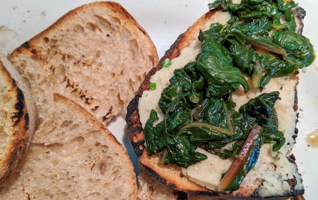 You already know I often make bruschetta, one of my favorite meals or snacks.  This bread was perfectly suited to both old and new versions — hence, “new”schetta (my apologies).  Since I had just made the bread yesterday, I soaked Ranch Gordo’s Marcella cannellini beans, so they could be cooked today.  The goal was to make a coarse white bean purée to serve with grilled bread.  We had a little leftover Swiss Chard from Small Farm, which was wilted and chopped, ready to go atop the purée.  That consumed three more thick slices and made a fine lunch.