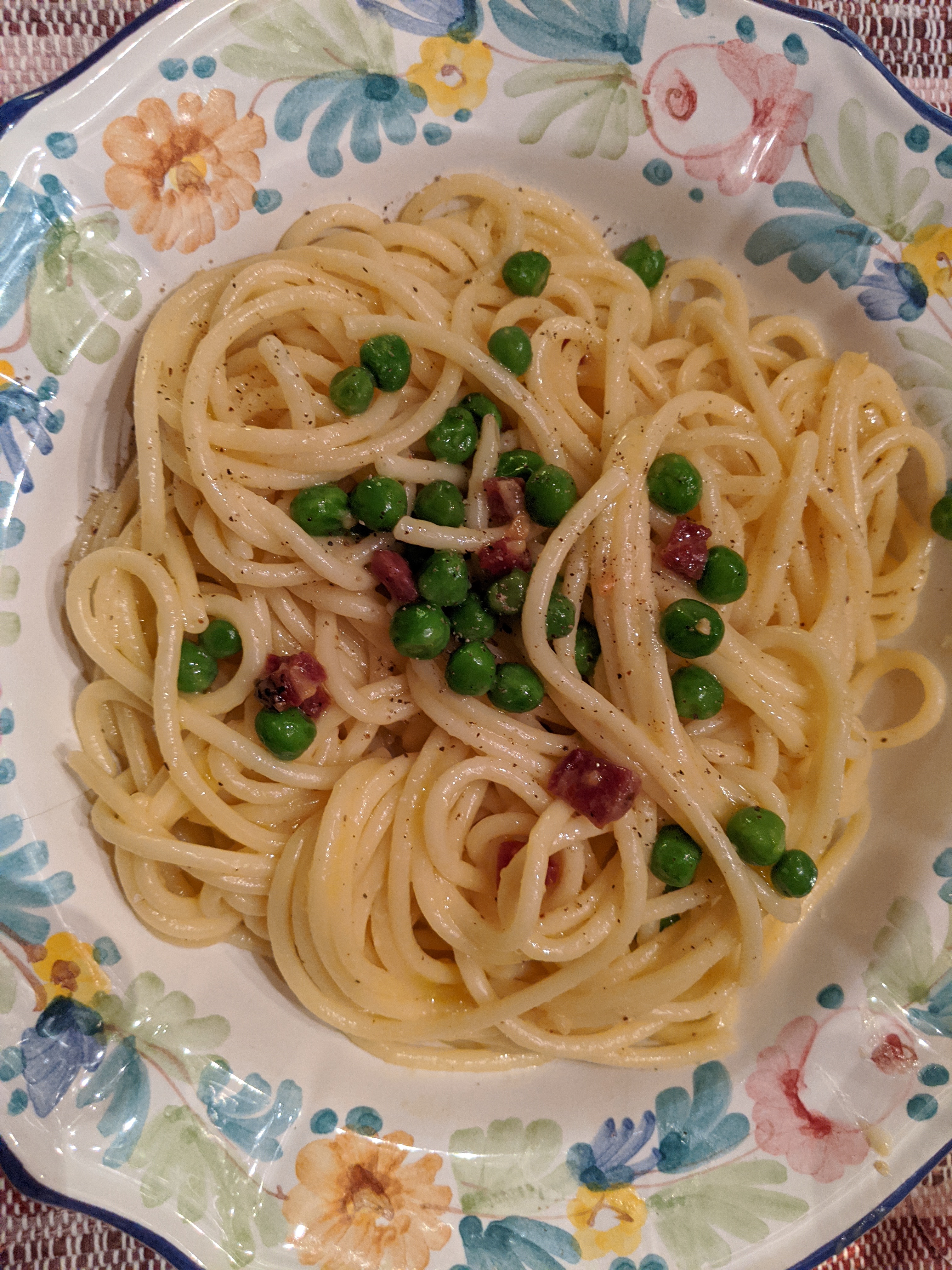 Spaghetti with Pancetta and Peas, a variation of Carbonara