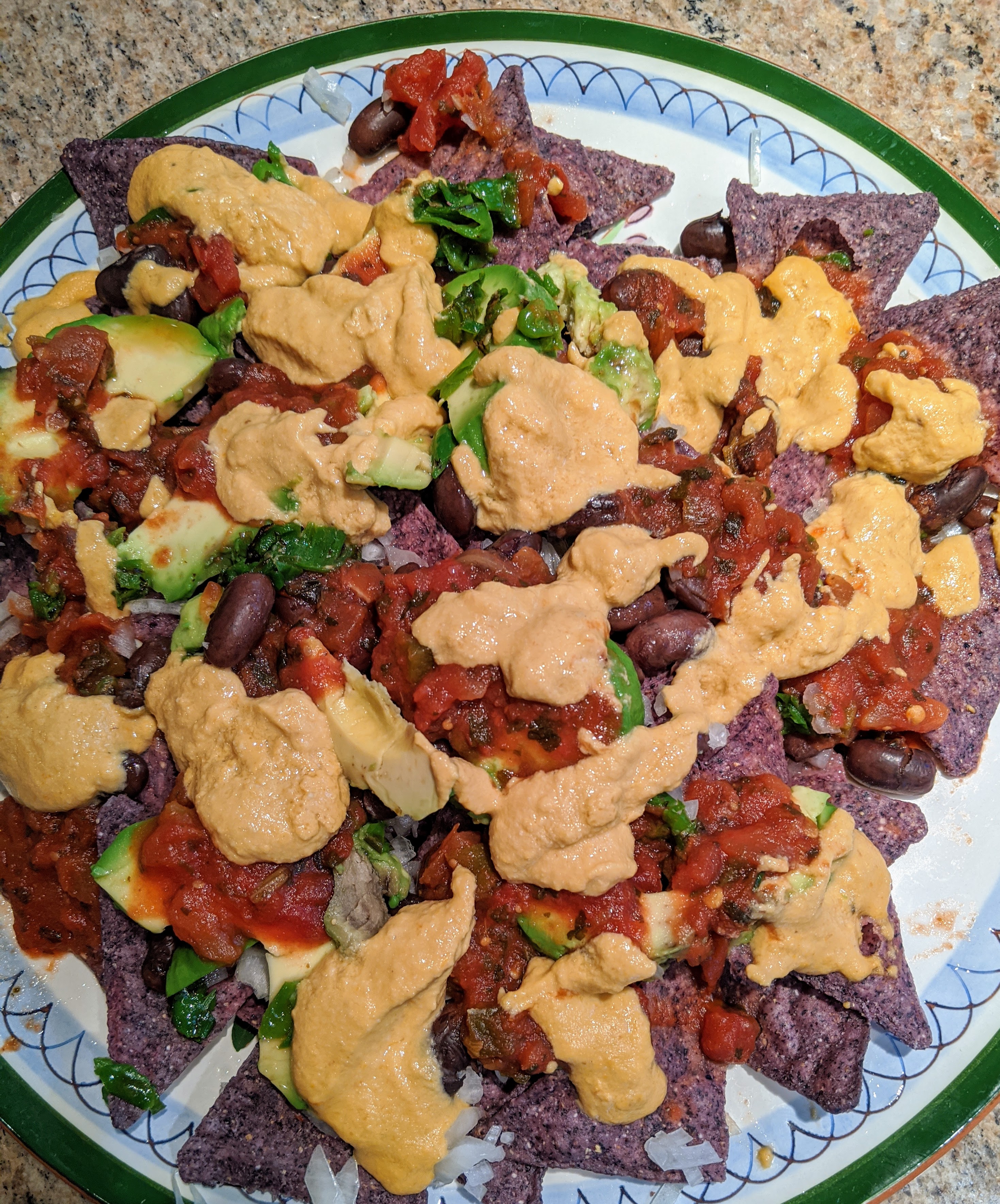 While I am filling in the details of recent meals, I realized I left out a surprise plate that I enjoyed for lunch to go along with the Chilean Cinsault in a recent post. The dish was just a plate of Nachos — but with a few flourishes. Blue corn chips and salsa, of course, but these were enhanced by vegan queso (made from cashews), Ranch Gordo heirloom Moro beans, finely-chopped Padron peppers from our deck railing garden, fresh chunks of ripe avocado, and a pretty serving plate.