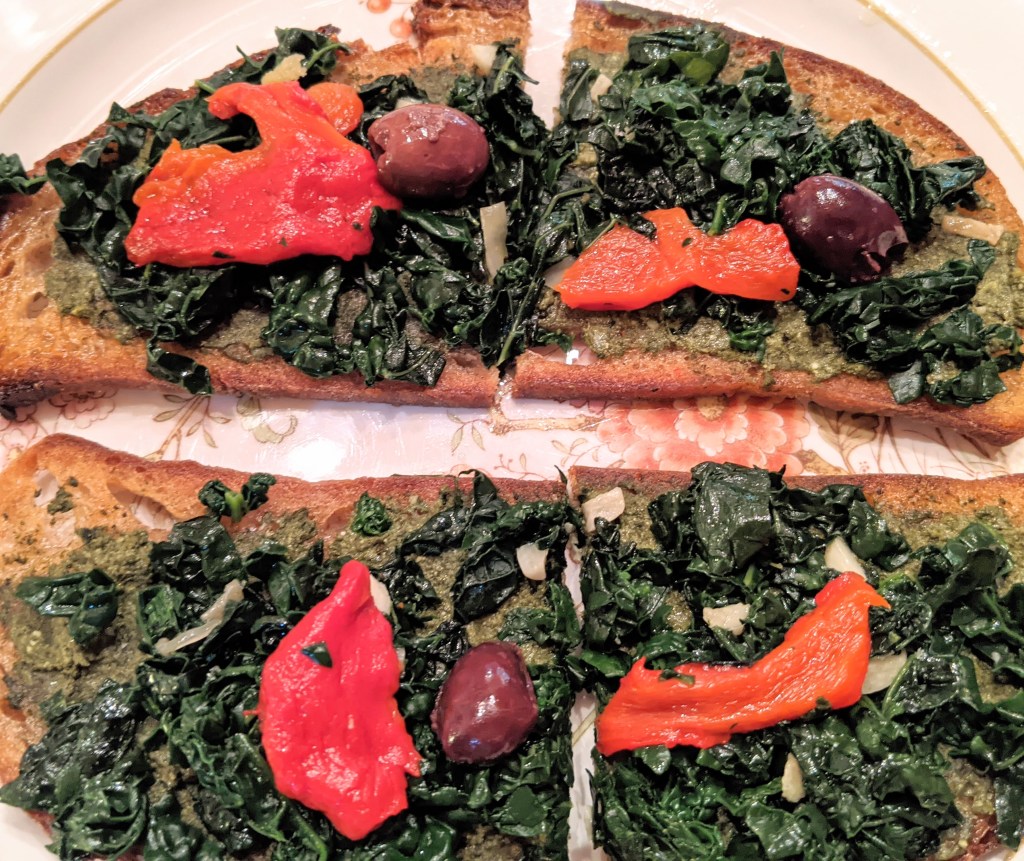 And, most recently, I can add yesterday’s lunch — another superb bruschetta with leftovers, accompanied by a well-aged wine.