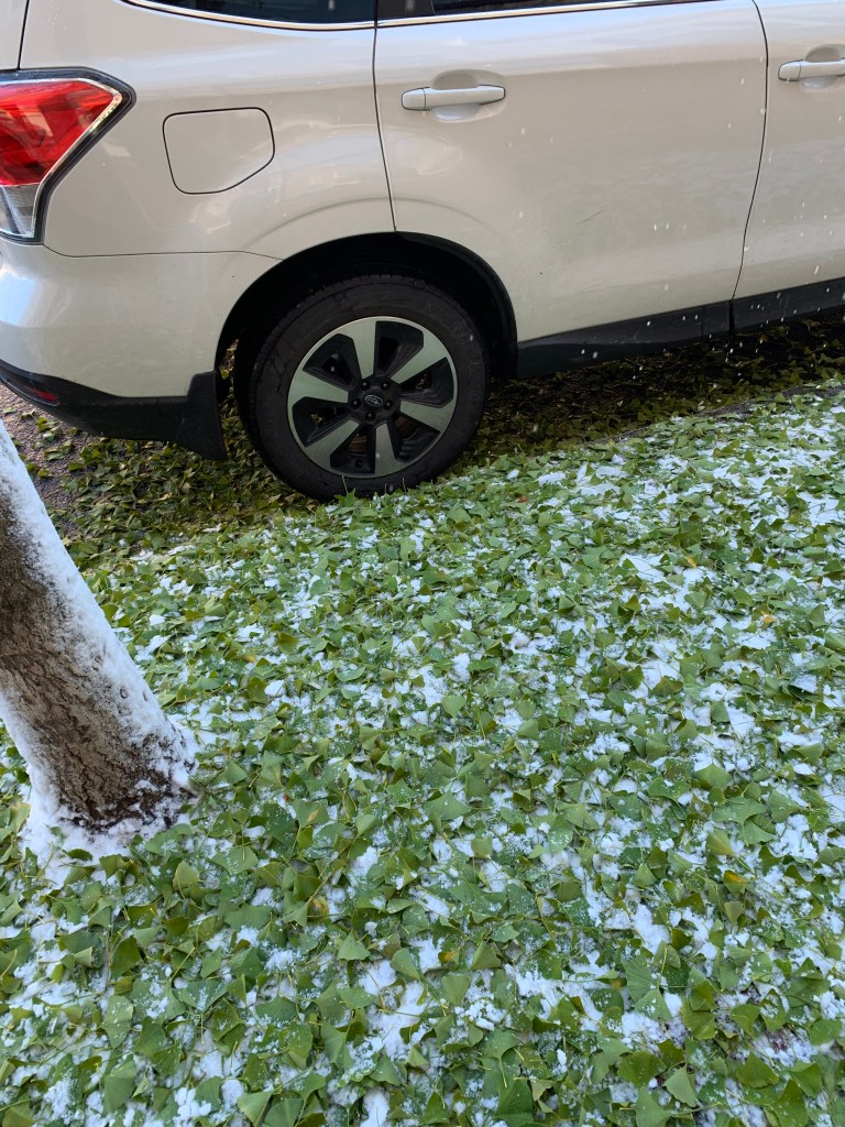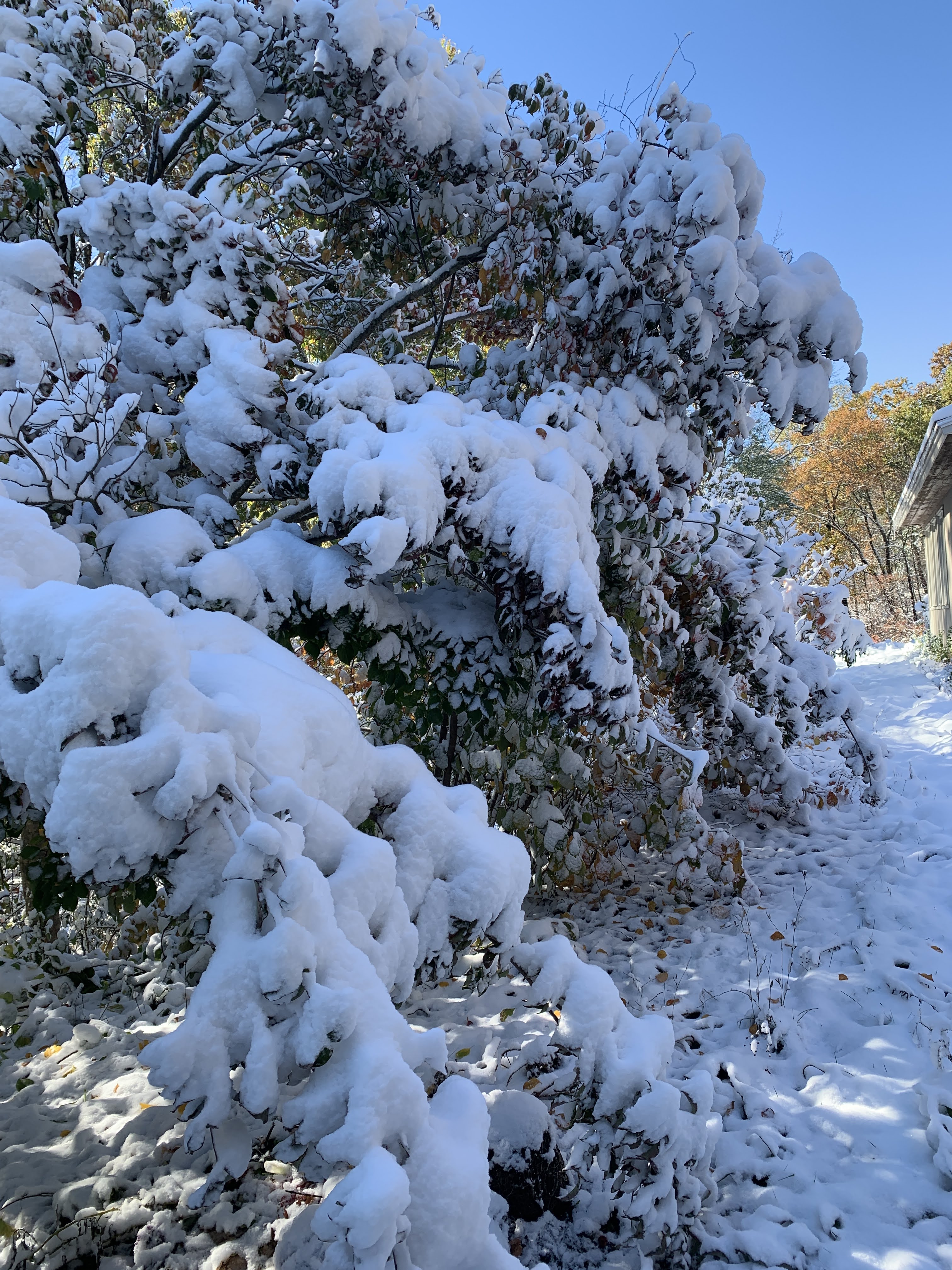 It’s rare for us to get snow in October, but last Friday (the 30th) we had almost 5″ of heavy wet snow. It was a nasty enough day that I postponed my food shopping trip to the city until Saturday. The photos, both here and in town, featured the snow and were punctuated visually by the bright leaves still on (or recently fallen off) the trees.