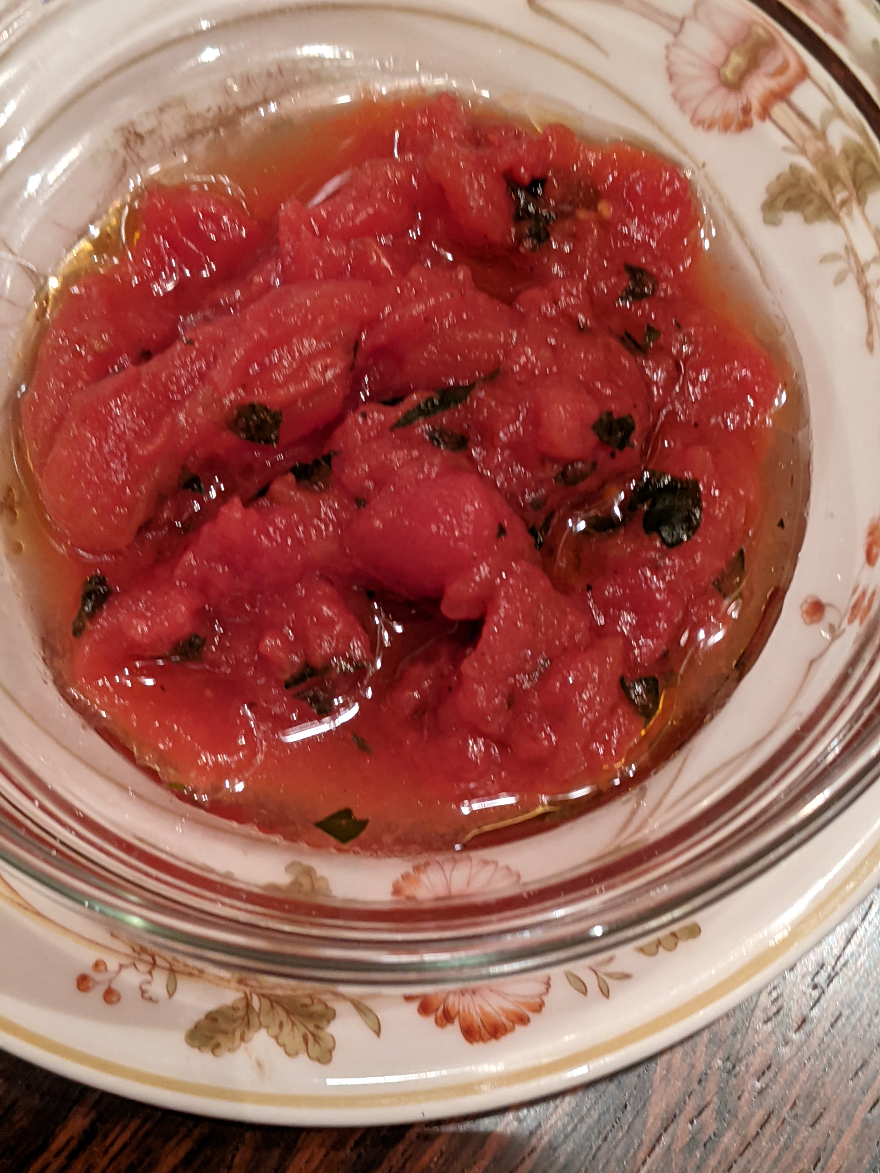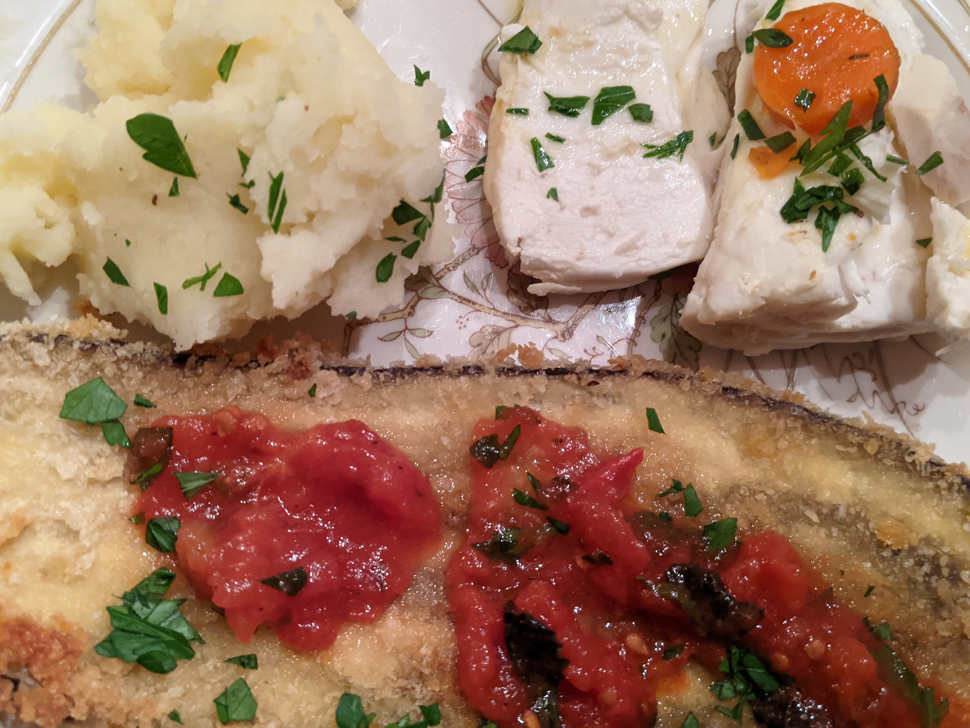 My last stop in the city was the fish store, for some delicious halibut, which Barbara poached for dinner, accompanied by baked eggplant with tomato sauce and mashed potatoes. It was a superb meal.