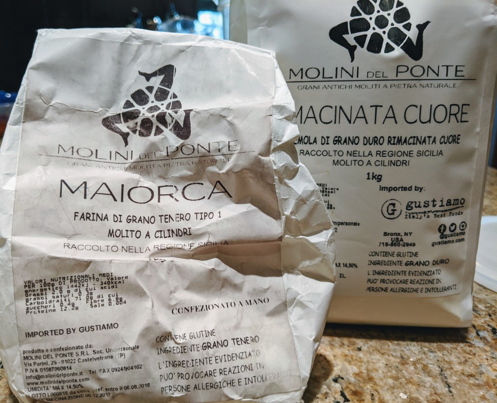 I recently received a shipment from my specialty supplier, Gustiamo, in NY, and it contained two different fine flours from Sicily. One was Maiorca, a soft wheat that I had used once or twice in my sourdough breads. The other was Rimacinata Cuore, a very fine hard durum wheat Semola, which I was eager to try for making pasta.