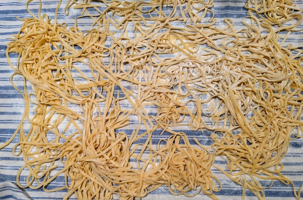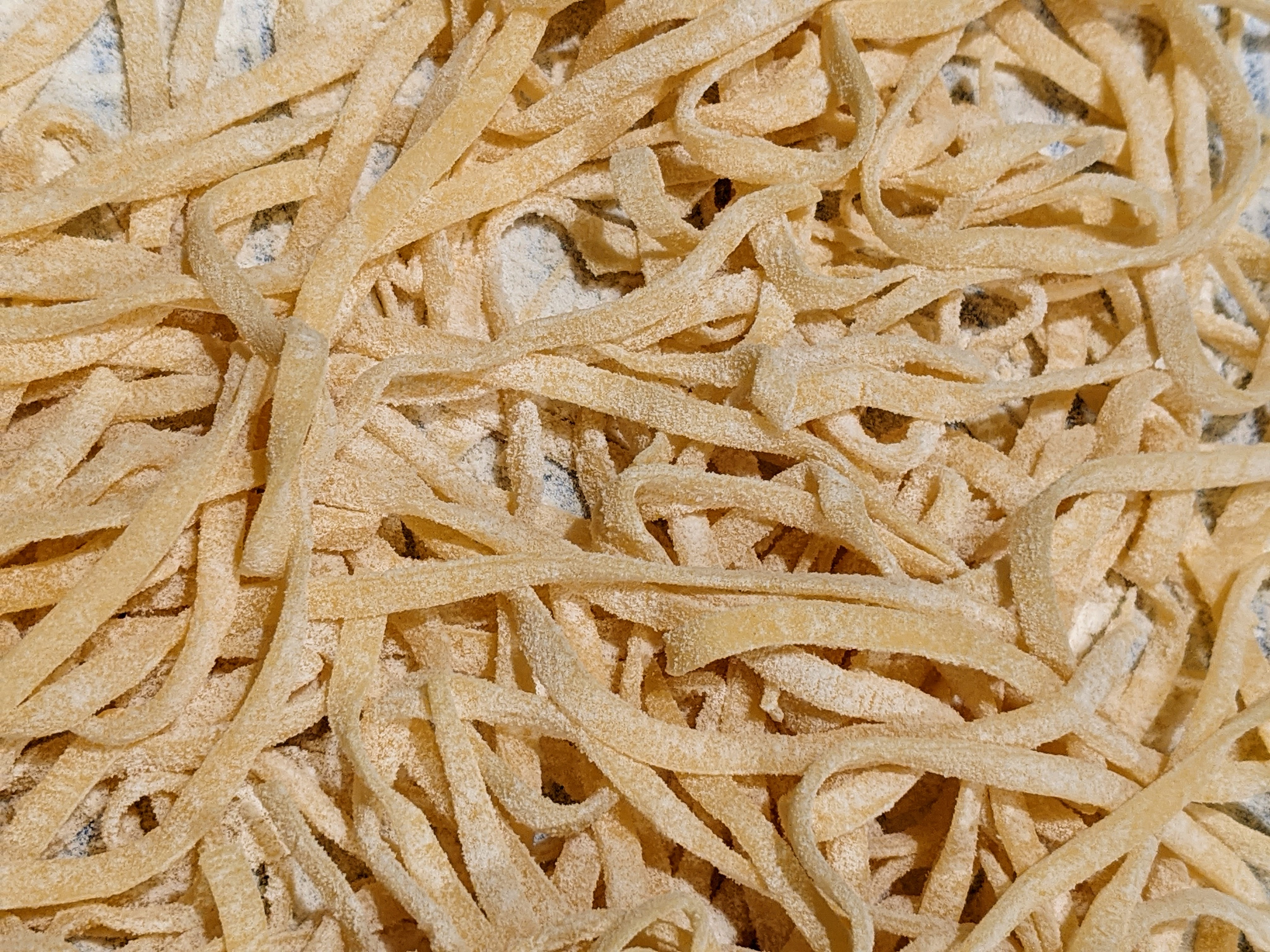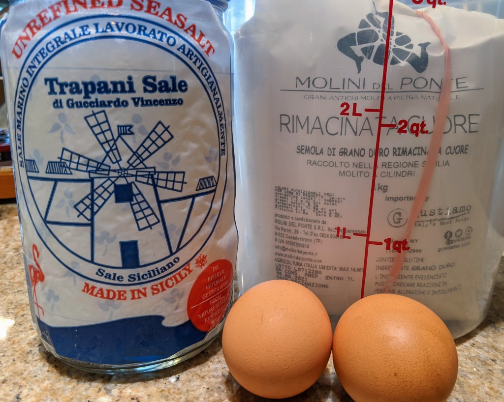 I decided to use 100 grams of each flour, plus 2 extra large eggs, and fine sea salt from Trapani (Sicily), to make enough pasta for one dinner and a couple of small lunches.