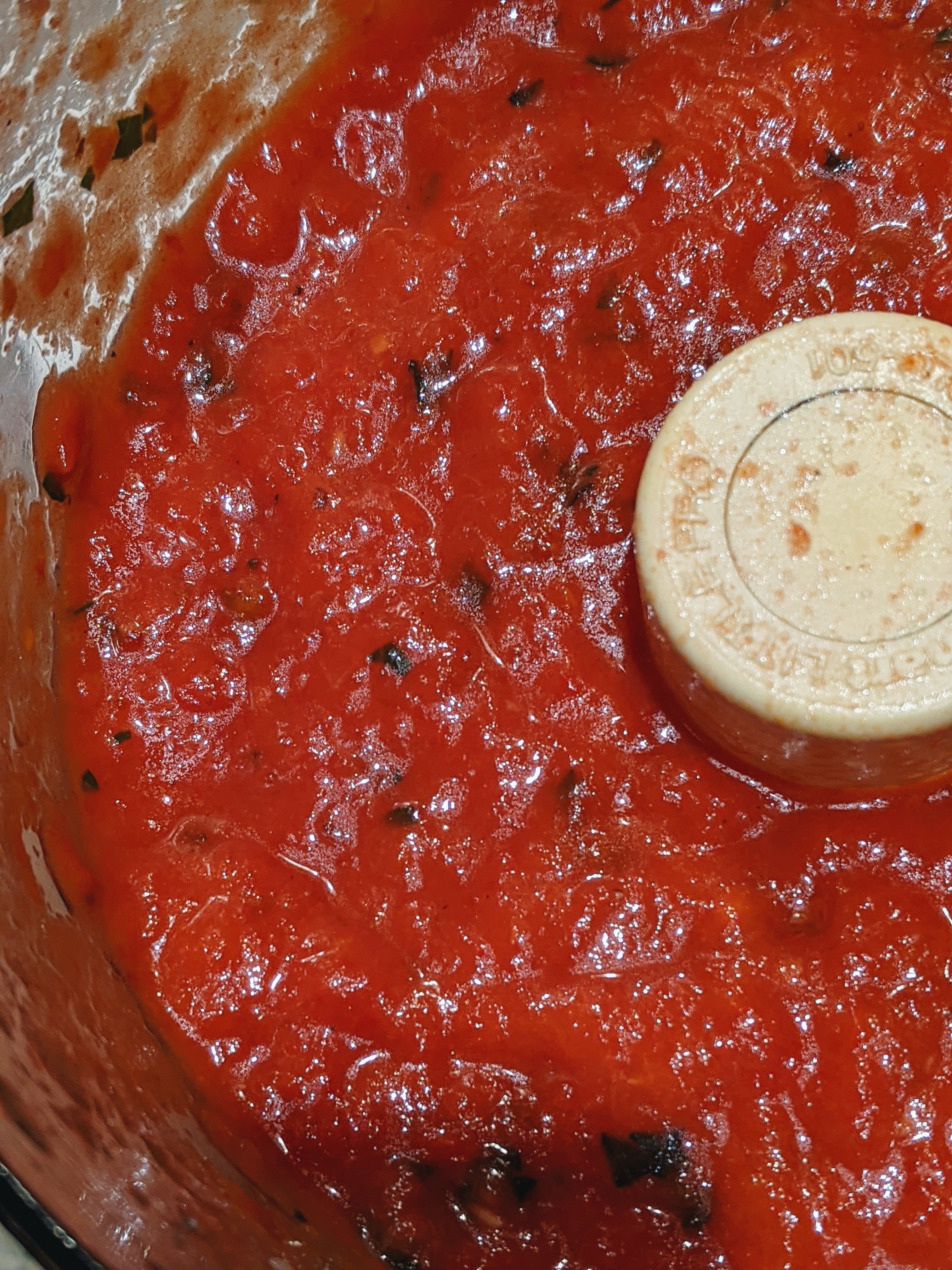 The other major component for my pasta that night was the sauce. I had some roasted, peeled sweet red peppers leftover in the refrigerator, plus the remaining tomato sauce from pizza-making a week earlier, so I decided to blend them together. Good choice! The depth of flavor from the peppers, the acidity of the tomatoes, and the verve from the sea salt combined to make a rich and satisfying sauce for me. I made Barbara’s pasta with Lucini tomato sauce from a jar, since she can’t eat peppers.