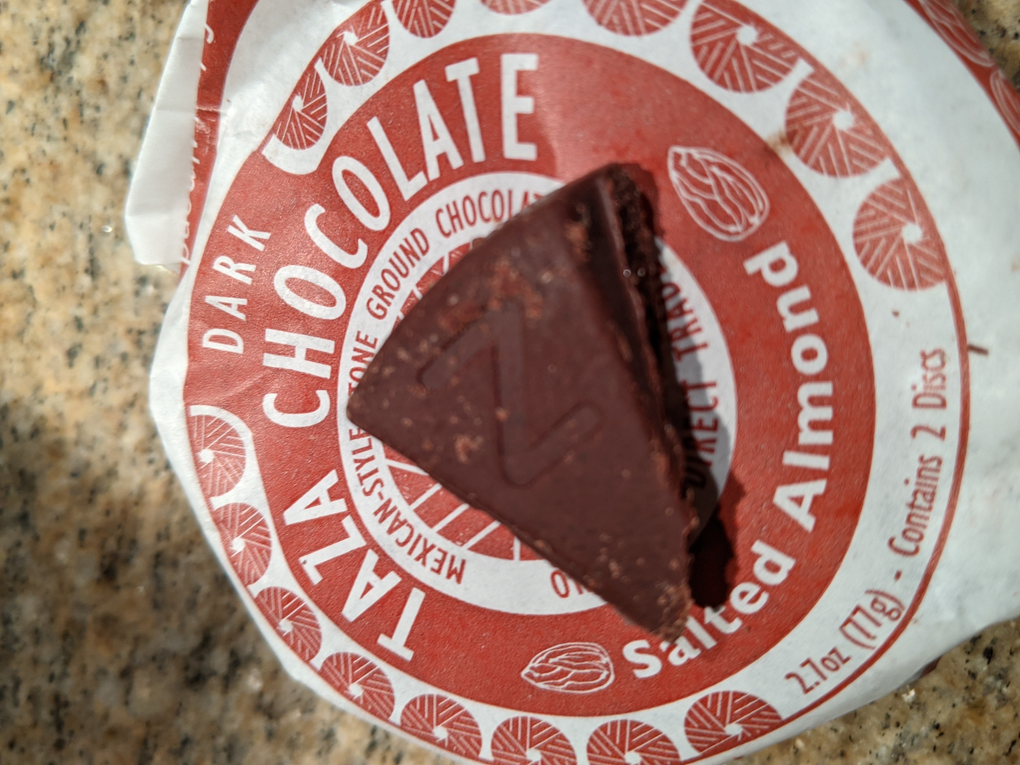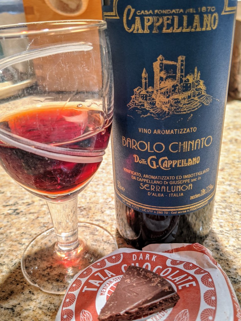 A bit later in the evening I decided to have a little dessert. A disk of Taza Chocolate Mexican-Style, Stone Ground Salted Almond, paired with a glass of Cappellano Barolo Chinato, completed it all.