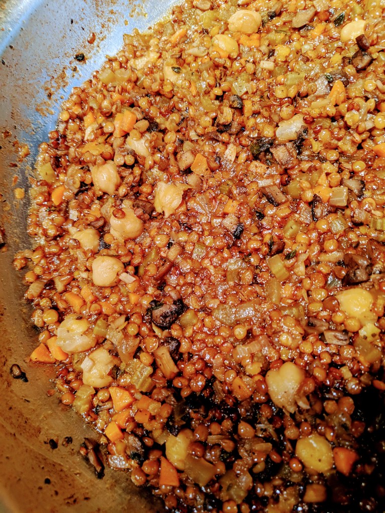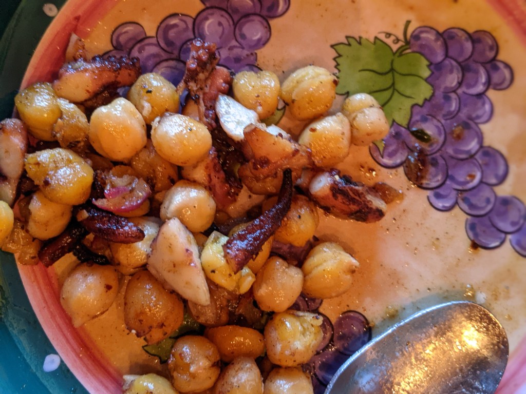 Sunday Night — Fried Crispy Baby Octopus with Chickpeas, Lentil Stew, Fumin wine and Quinta Luna Olive Oil from Italy