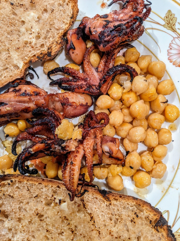 Grilled Baby Octopus, Grilled Sourdough, and Portuguese Chickpeas