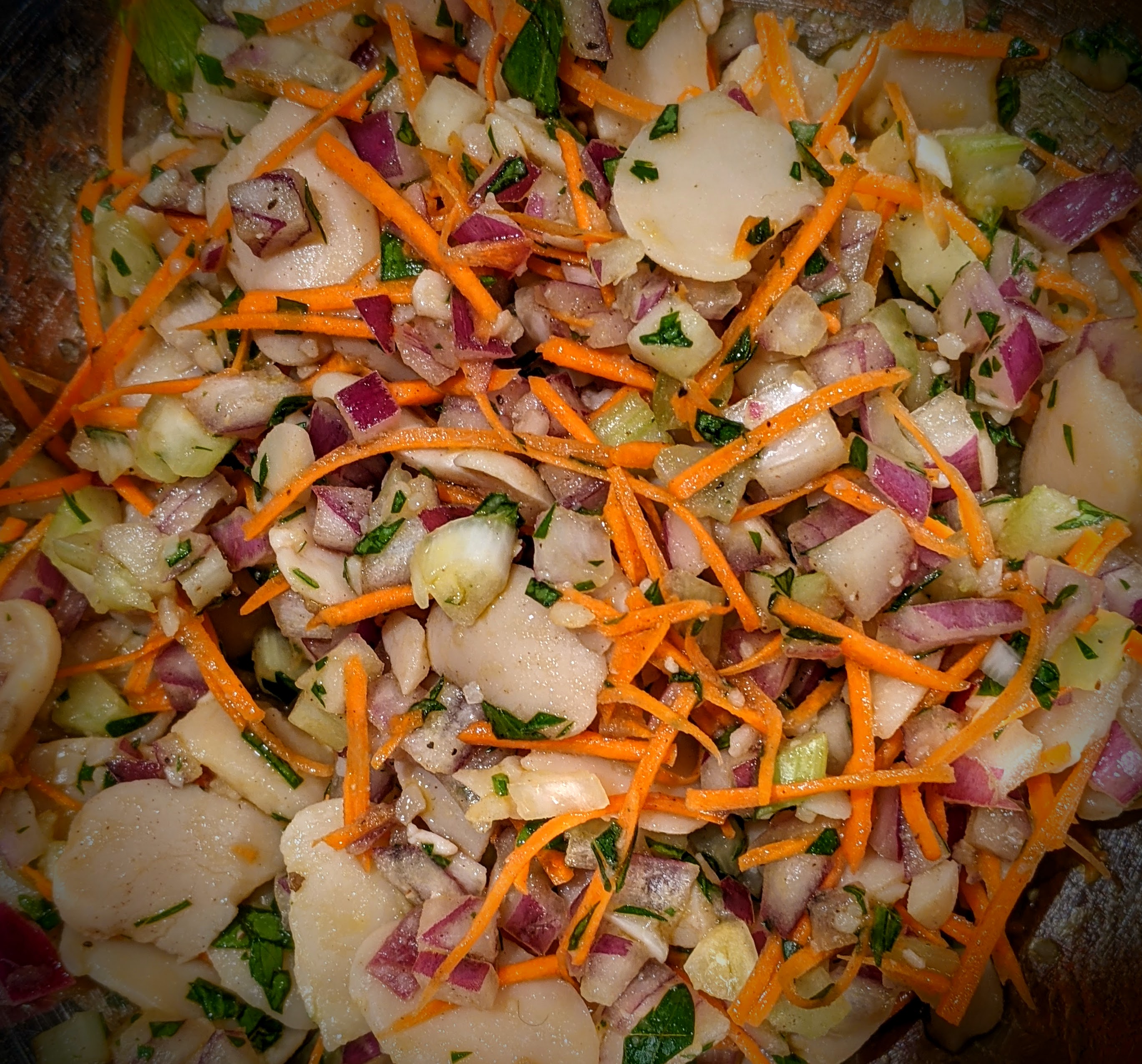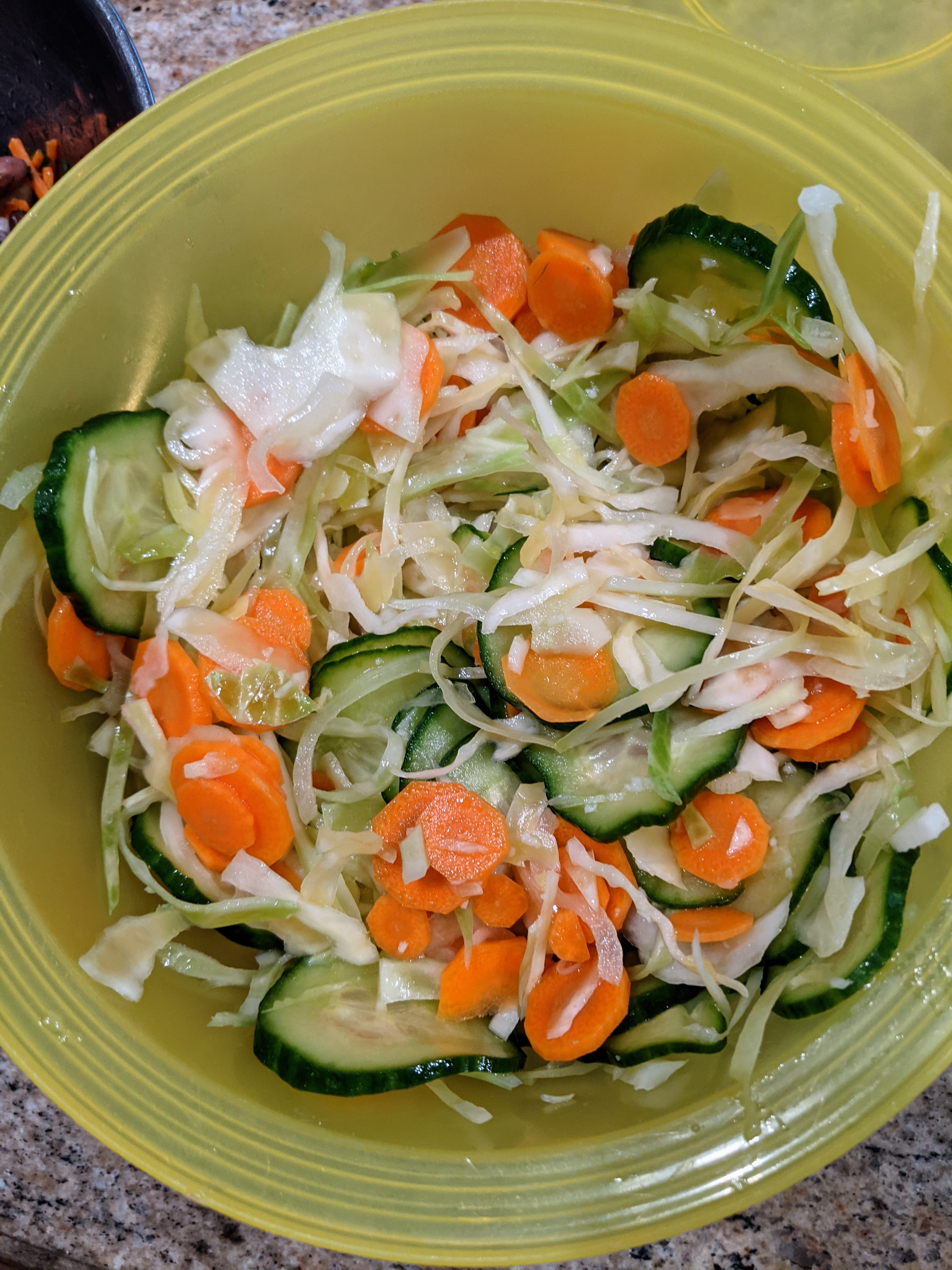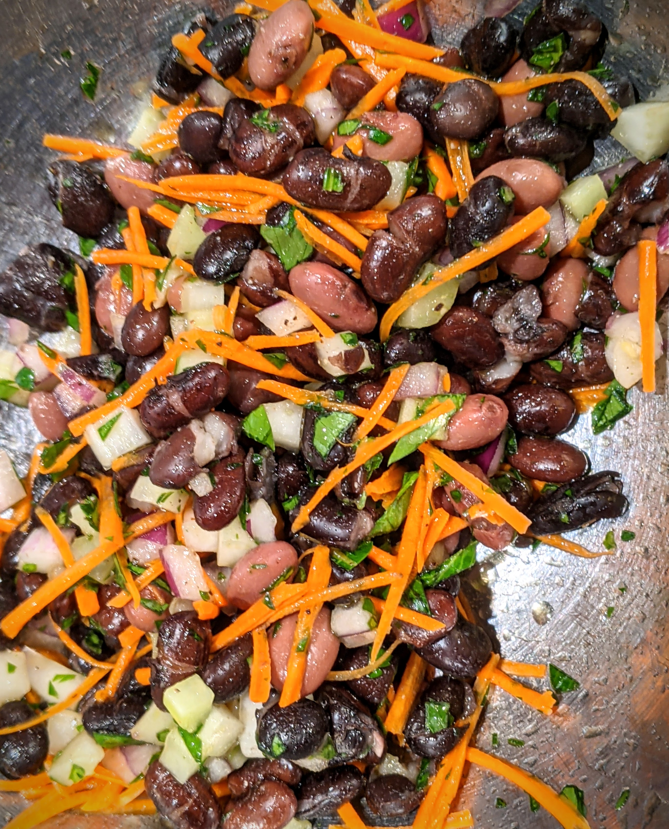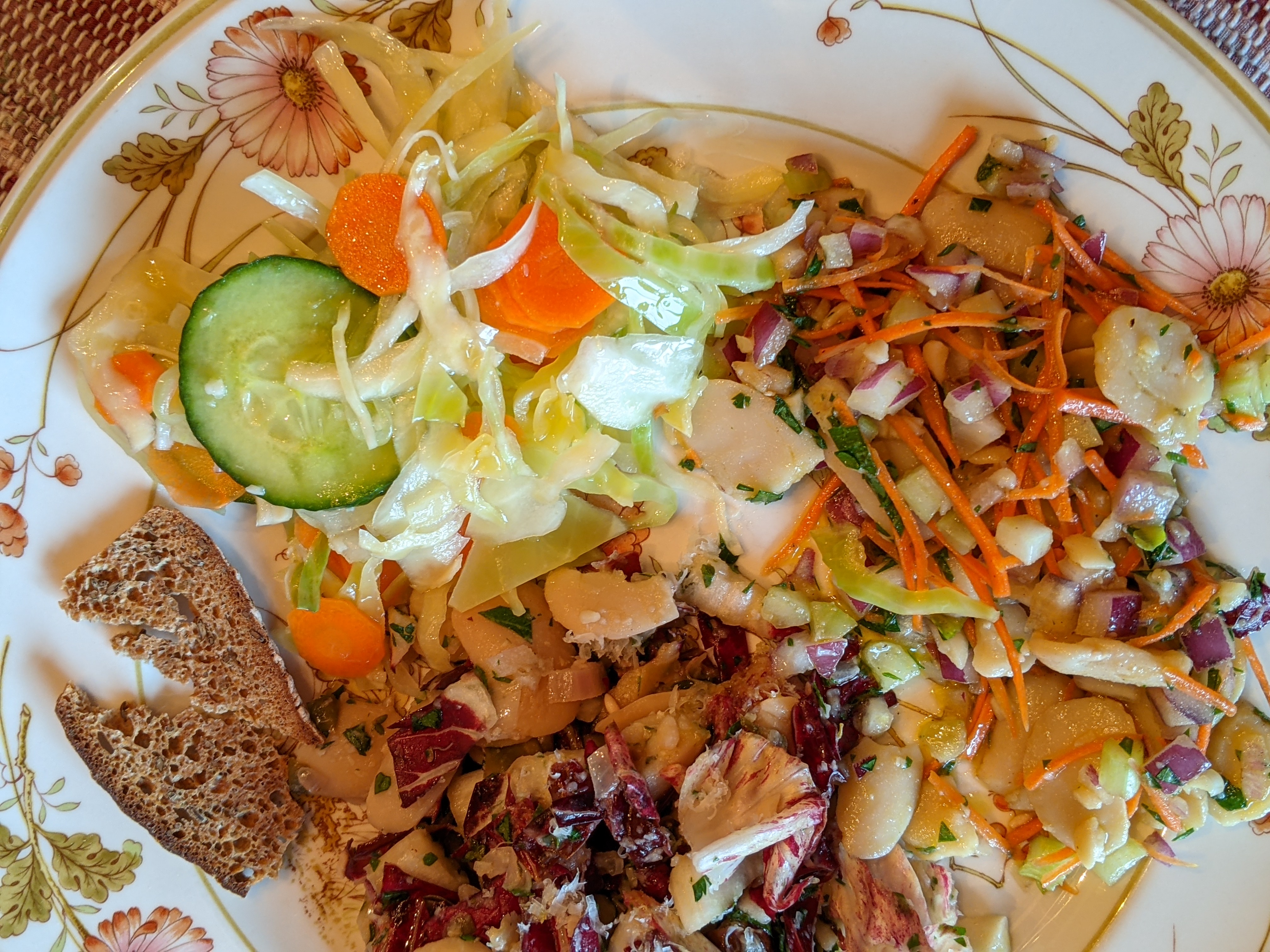 The following day I decided to make some bean salads — two salads with Corona beans, and since Barbara prefers other beans, I made one for her with black beans plus an heirloom Rancho Gordo beans from Mexico. Since this appeared to be salad day, I discovered that she had made a salad, too. This was the famous Claremont Salad, a signature dish in the high-end Claremont Diner in Verona, NJ, in the 1950’s. Her version consisted of cucumber, cabbage, carrots, and onion, pickled in a slightly-sweet vinegar dressing. (She eschews pepper, and forgot the celery vs. the original recipe.)