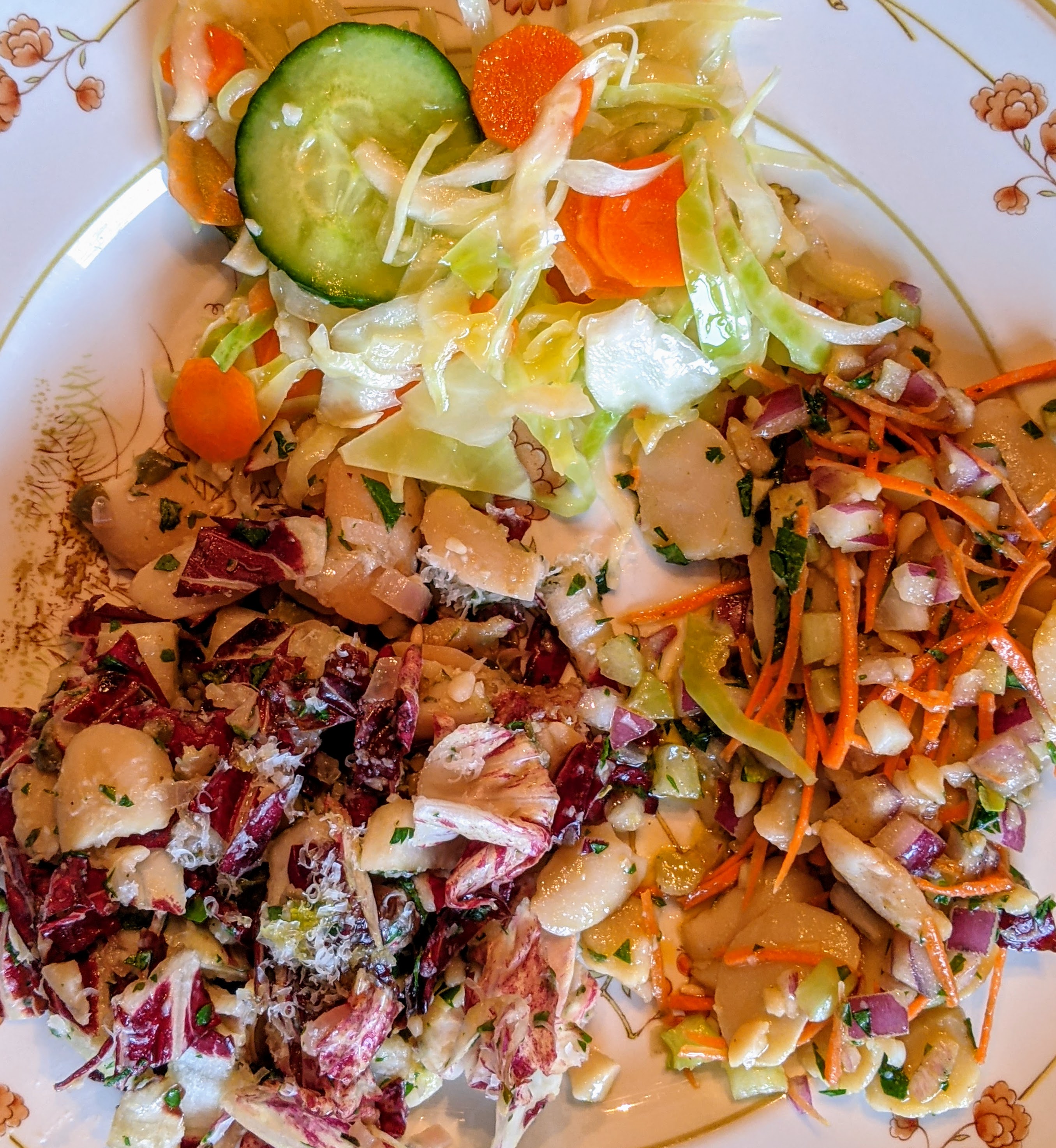 Salad: Corona beans, with chopped radicchio Treviso, radicchio Castelfranco, grated Calabrian Pecorino, and plenty of top quality olive oil and red wine vinegar