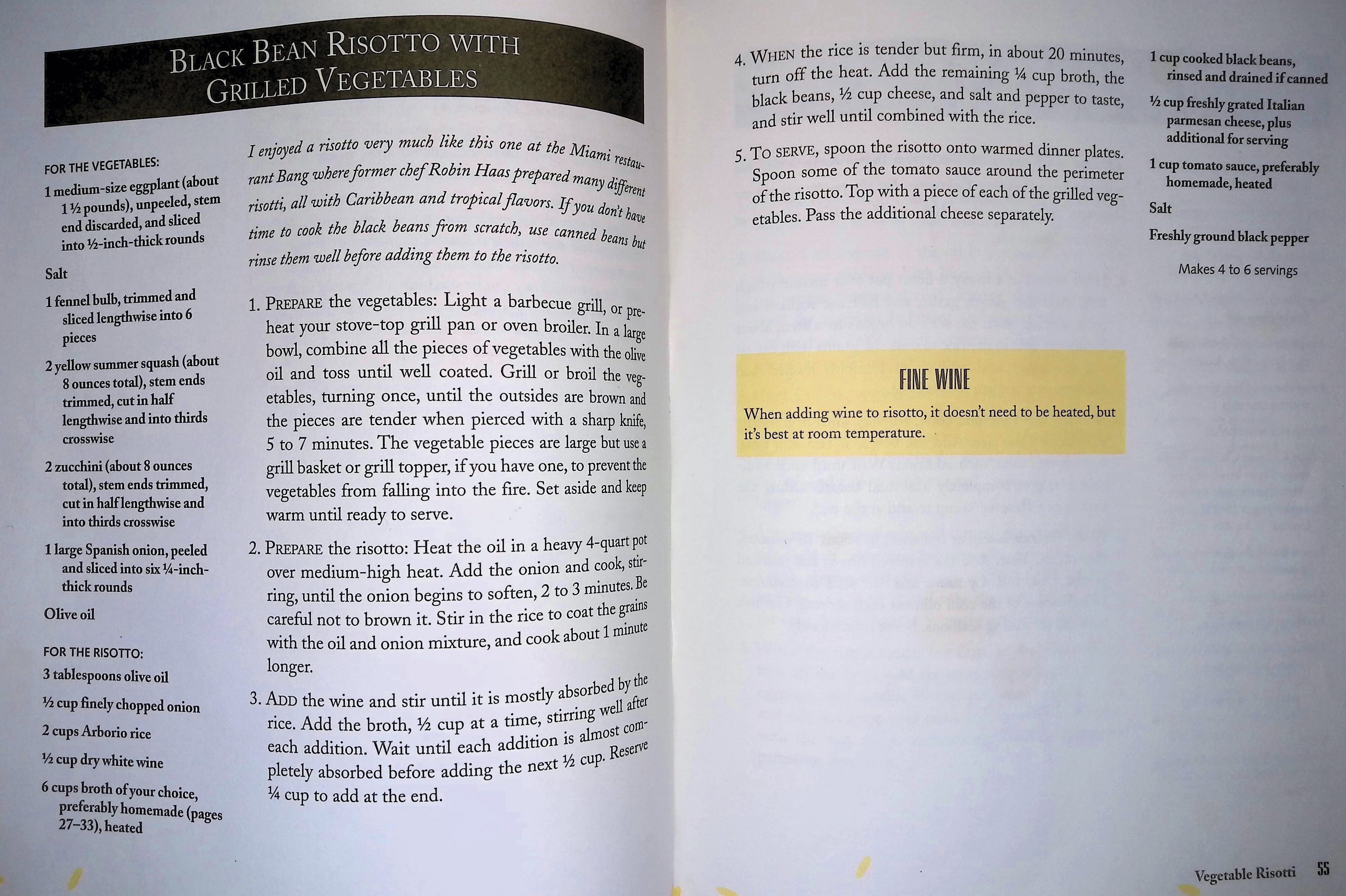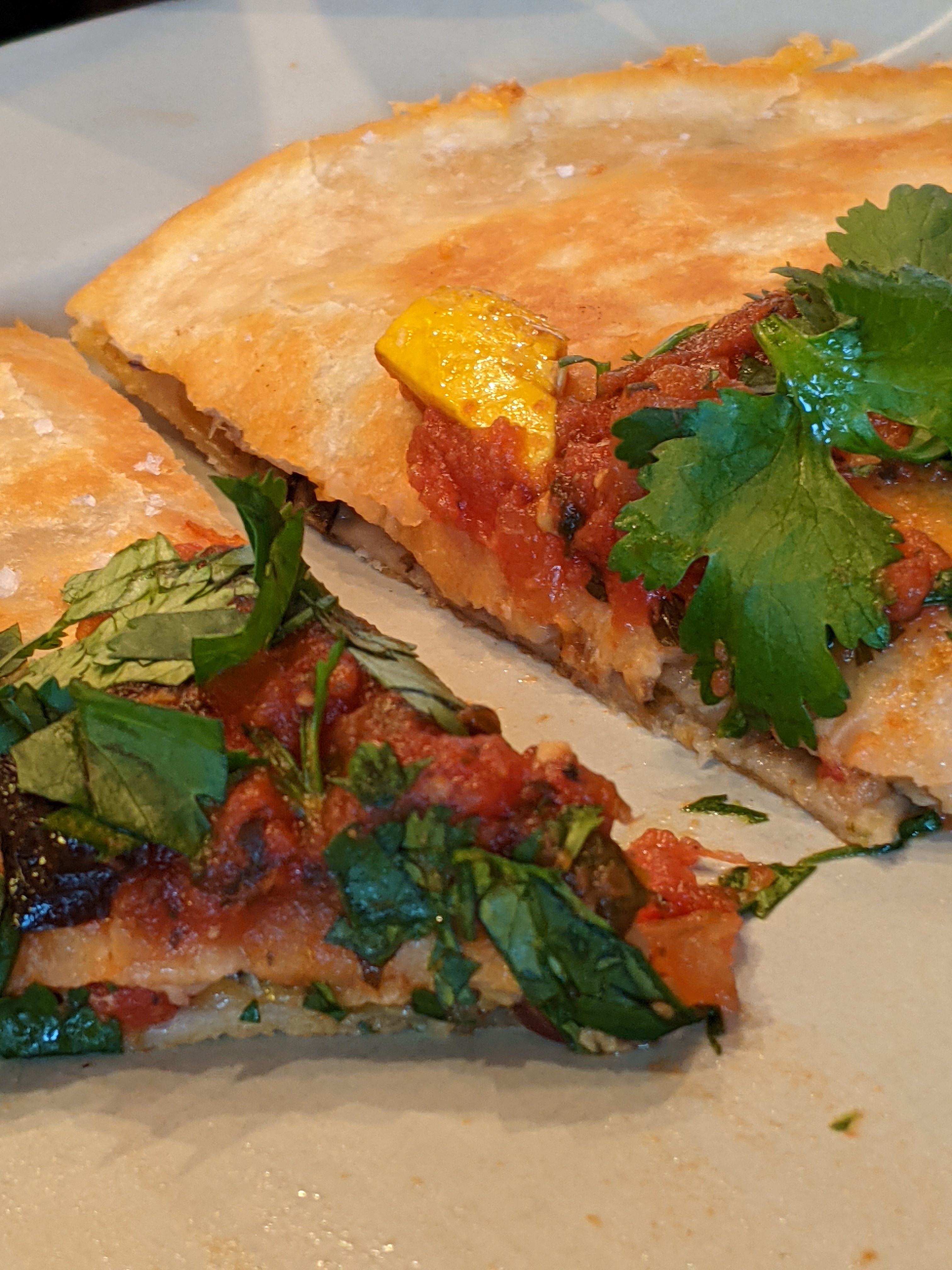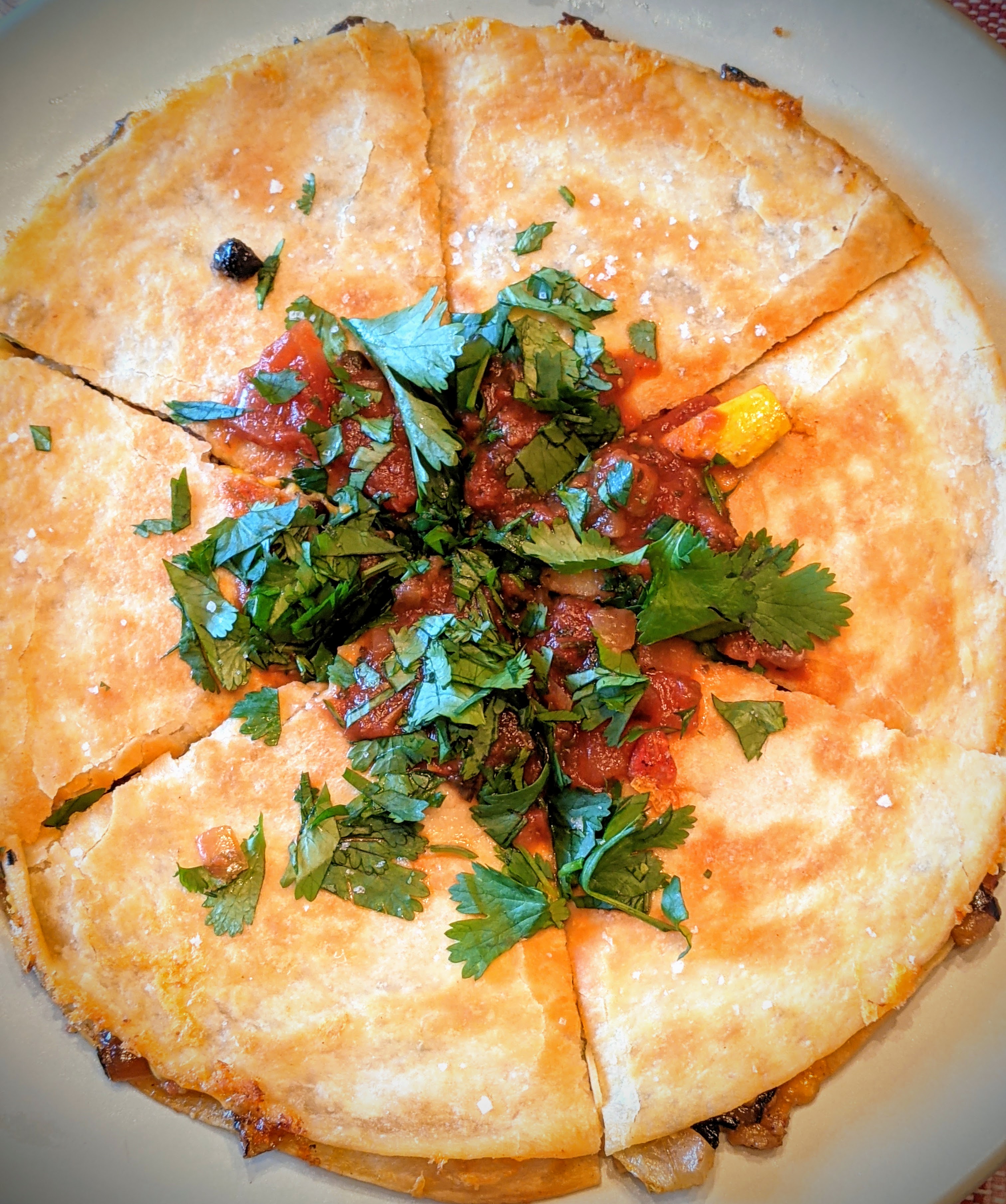 Grilled Vegetable Quesadilla. Fortunately, I saved the remainder of the vegetables (the risotto did not require very much of them). That gave me an opportunity to make a quesadilla with them a few nights later. Flour tortillas and grated Colby cheese, plus black beans, salsa and cilantro were all I needed. I was delighted with the results, starting with a Cuban or Caribbean take on an Italian risotto, and ending with a Mexican or Tex-Mex version of a quick quesadilla, successfully accompanied by a red wine from Puglia in Southern Italy — a cross-cultural event indeed.