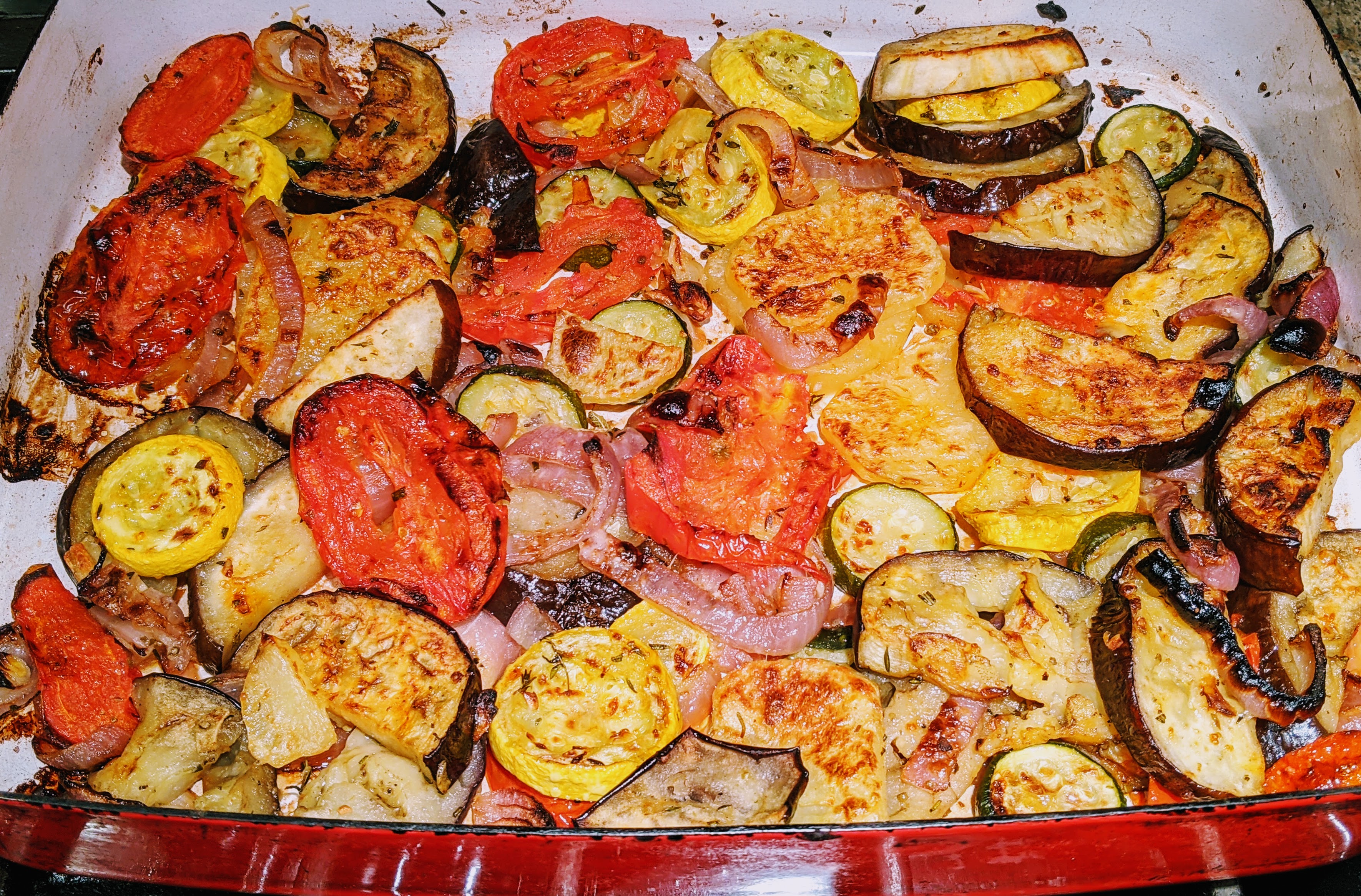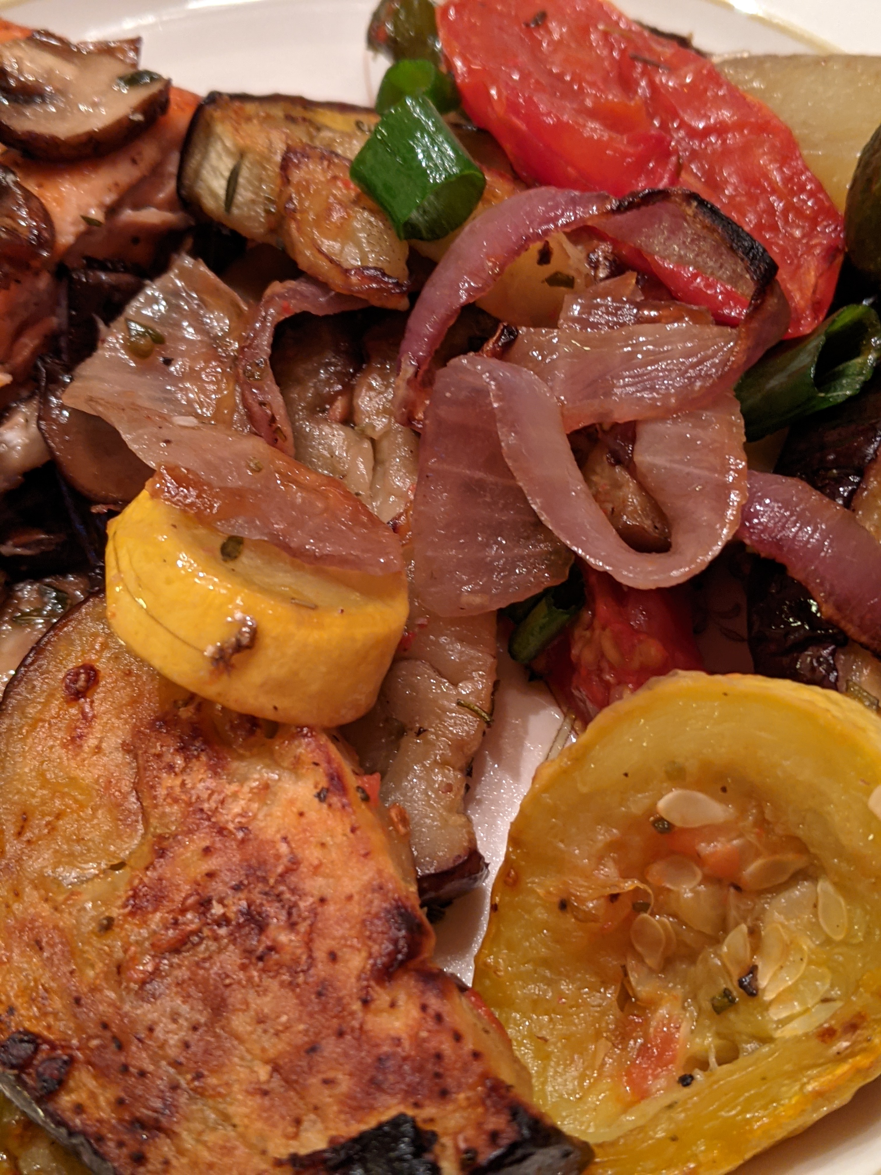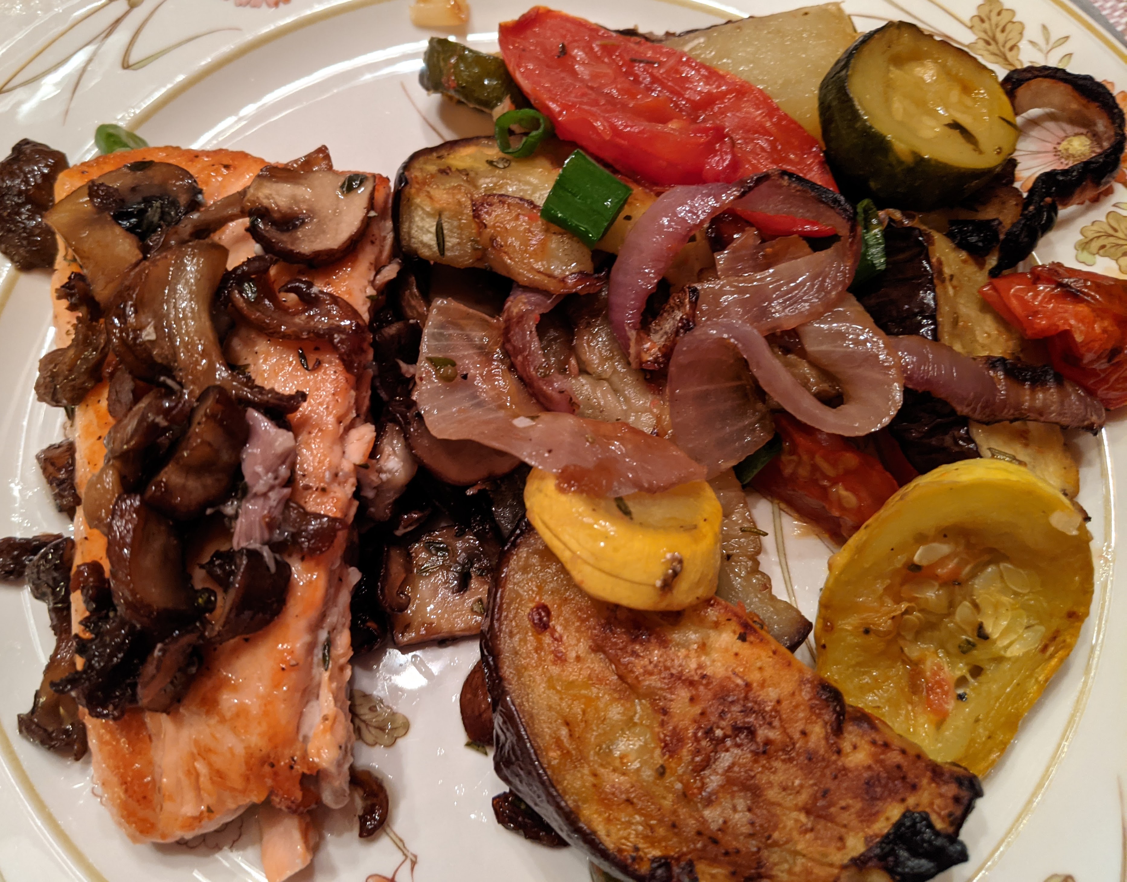 Roasted vegetables are always a treat, and an easy meal is one of those dishes with a piece of fish. A couple of nights ago, I chose Briam (or Briami), a Greek dish of Mediterranean vegetables, along with a small fillet of salmon with some roasted wild mushrooms.