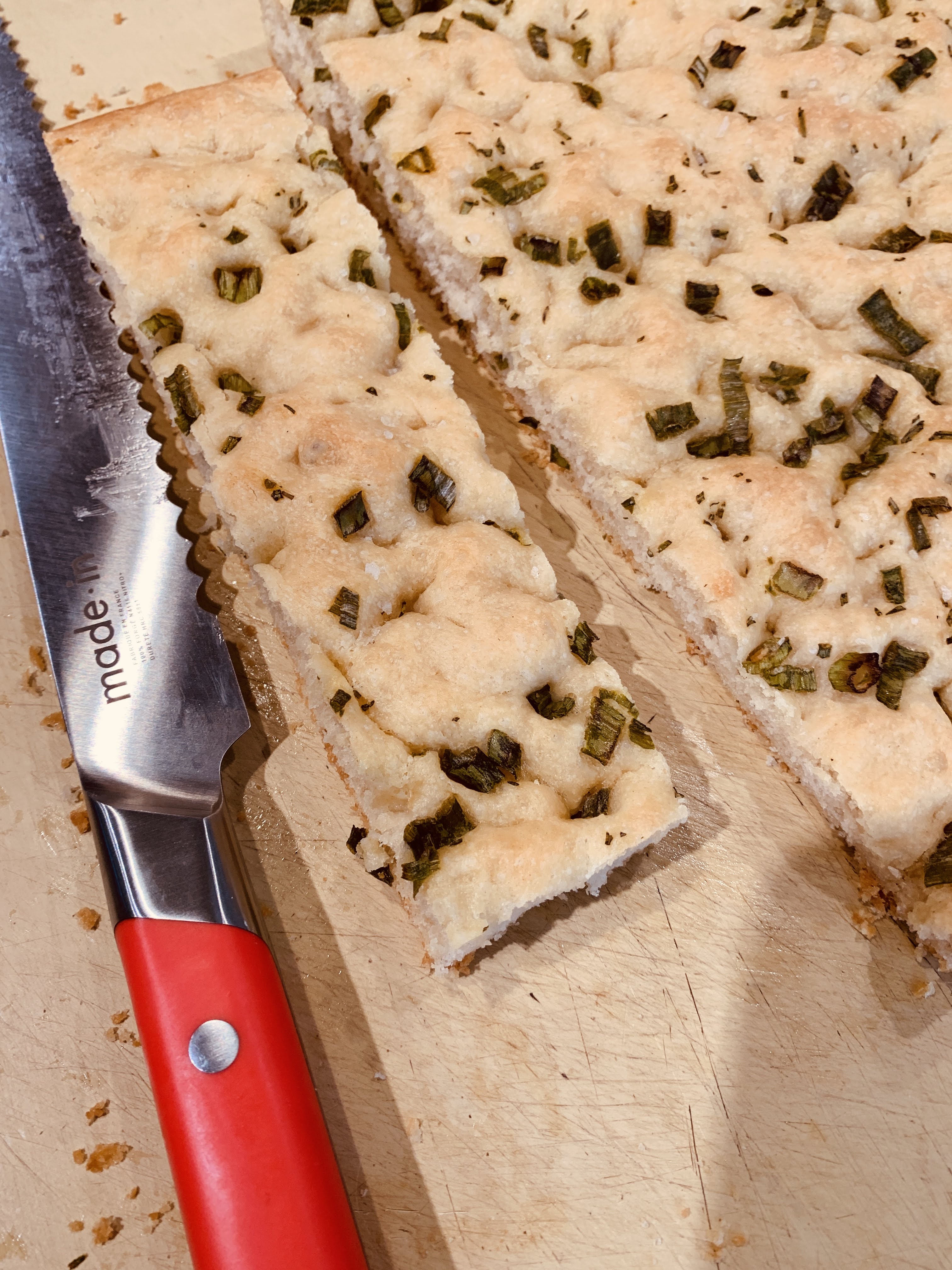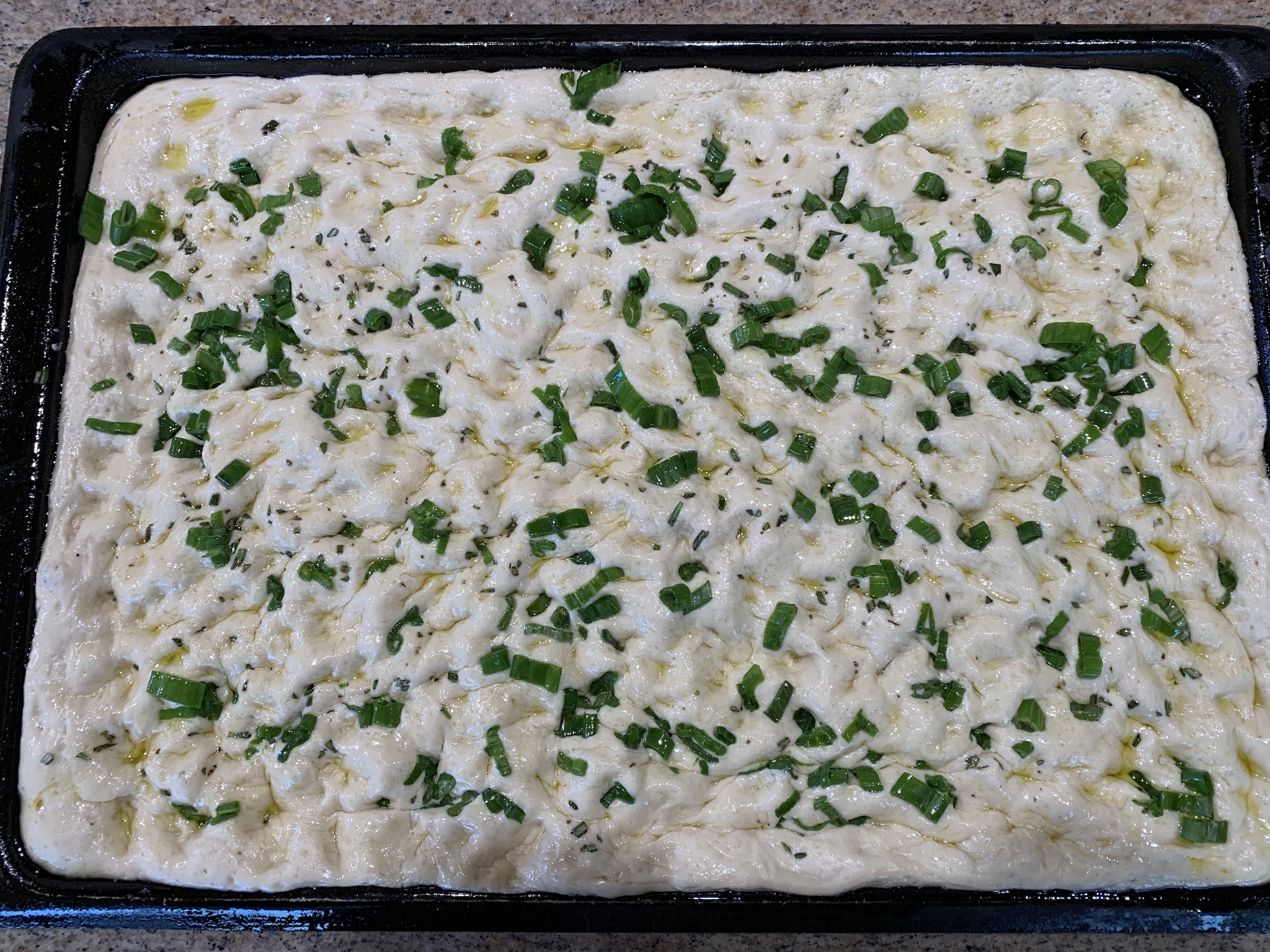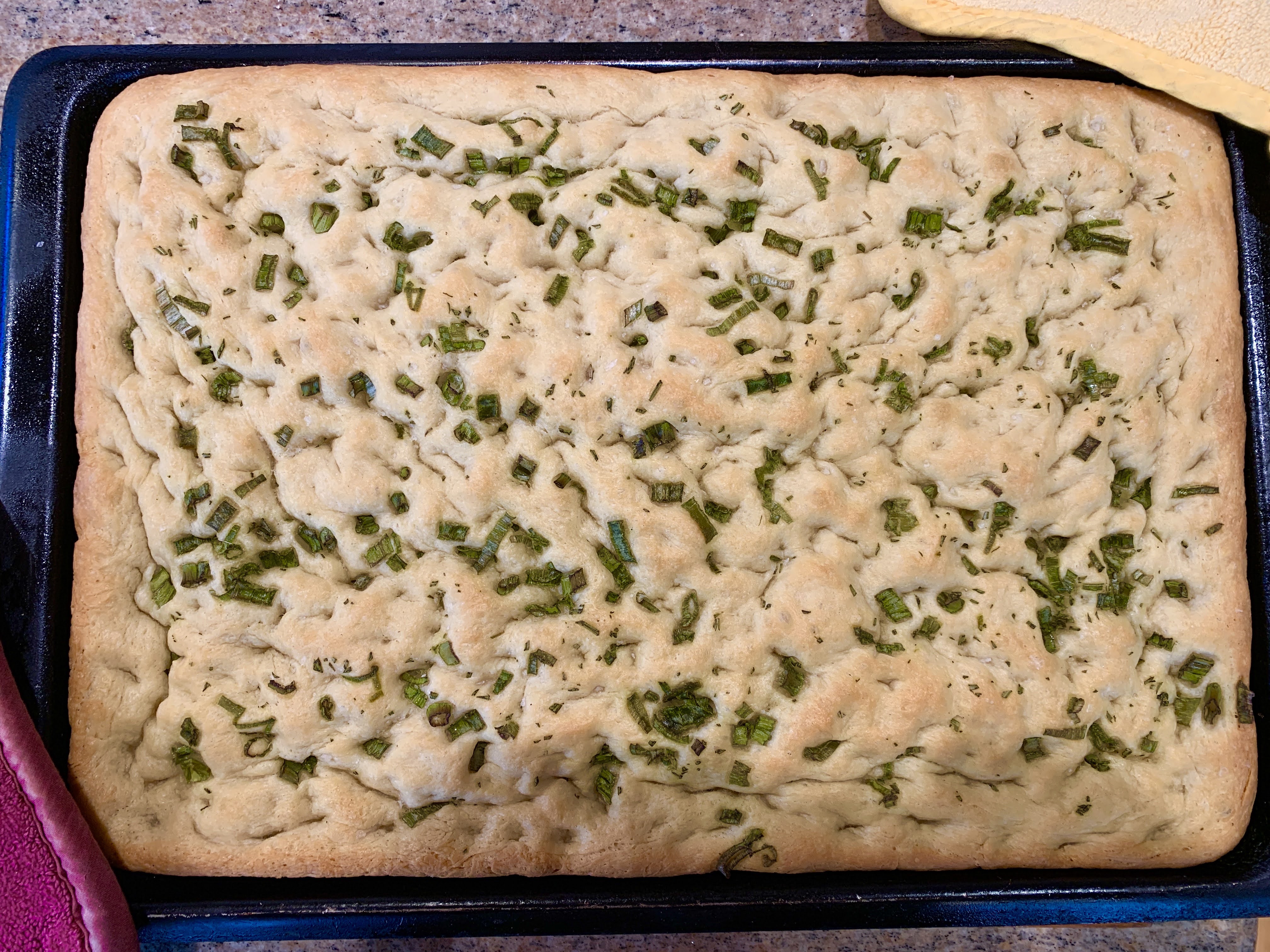 The other thing about focaccia is that it is best eaten in the first 6-8 hours after baking. My experience has been that reheated focaccia the next day was very disappointing. Amazingly, this recipe was good for almost a week. Of course, it was best when fresh, but toasted or pan-fried, it was enjoyable much longer than usual. I particularly liked serving it with Pecorino or Feta cheese.