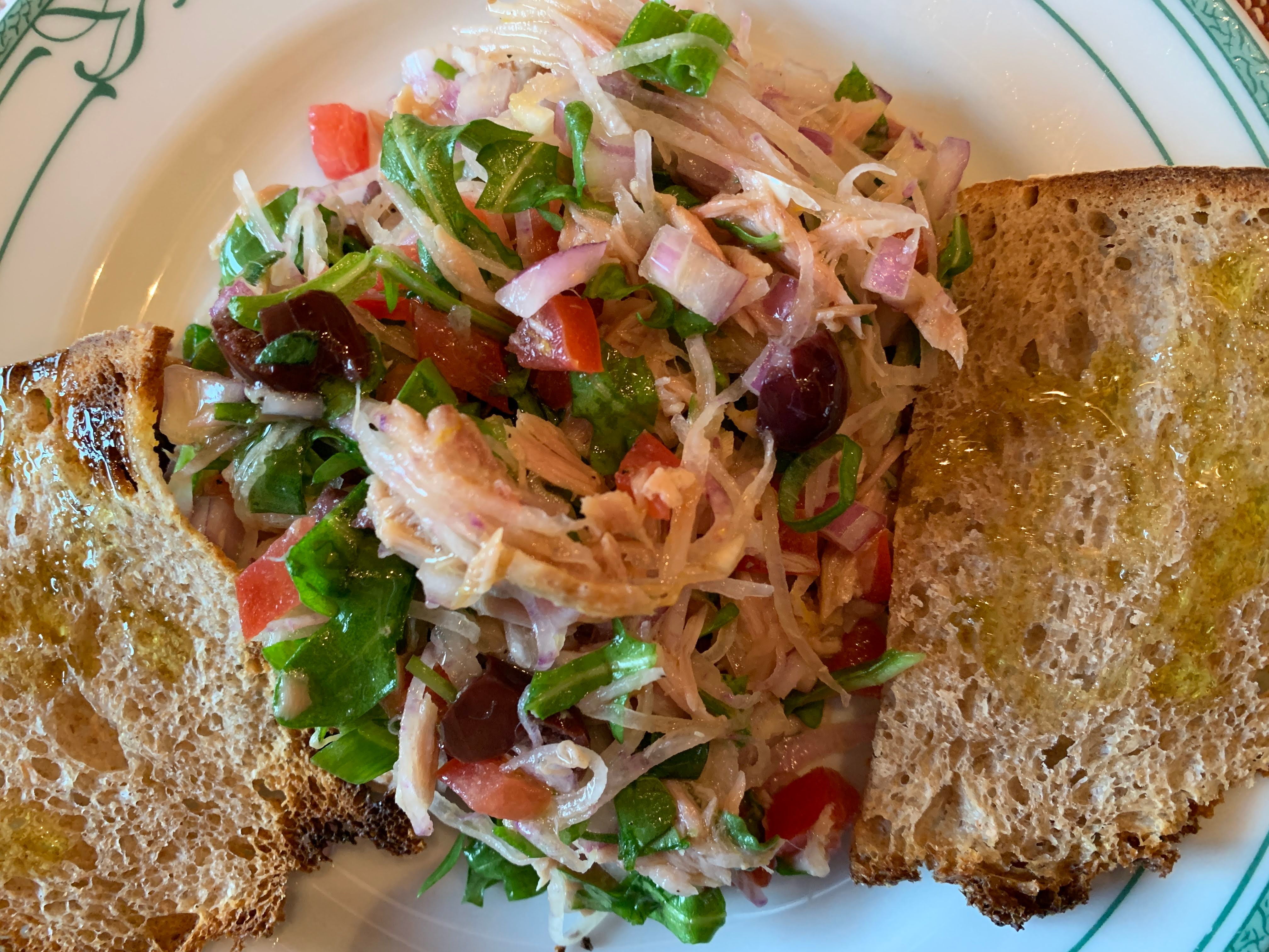 Toss it all together, and put on the plate. Toast a few pieces of sourdough bread, drizzle with olive oil. Pour a glass of red wine, and dig in.
