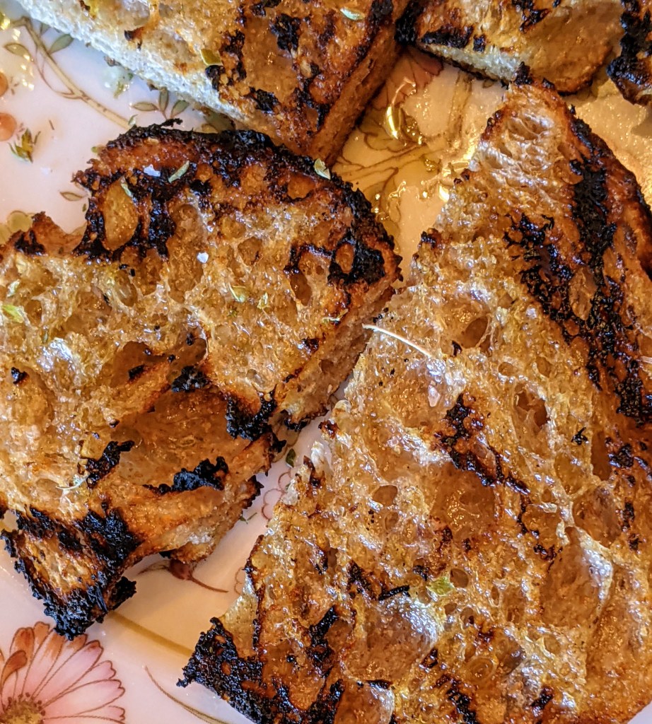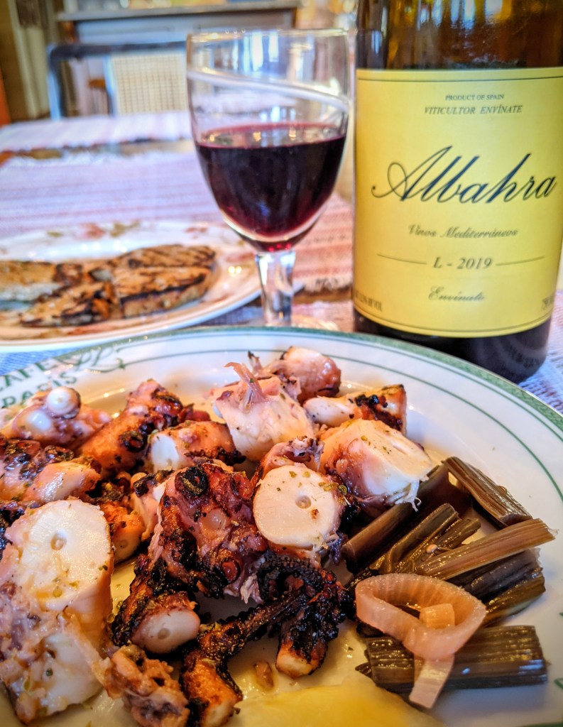 The next day I removed two tentacles from the marinade, placed them on a very hot gas grill to get charred and crispy, and served them for lunch — adding only some sea salt, olive oil and a little Portuguese red wine vinegar — alongside a few pieces of my grilled sourdough bread. For the wine, I chose an already-opened 2019 Albahra, a Garnacha from the Canary Islands.