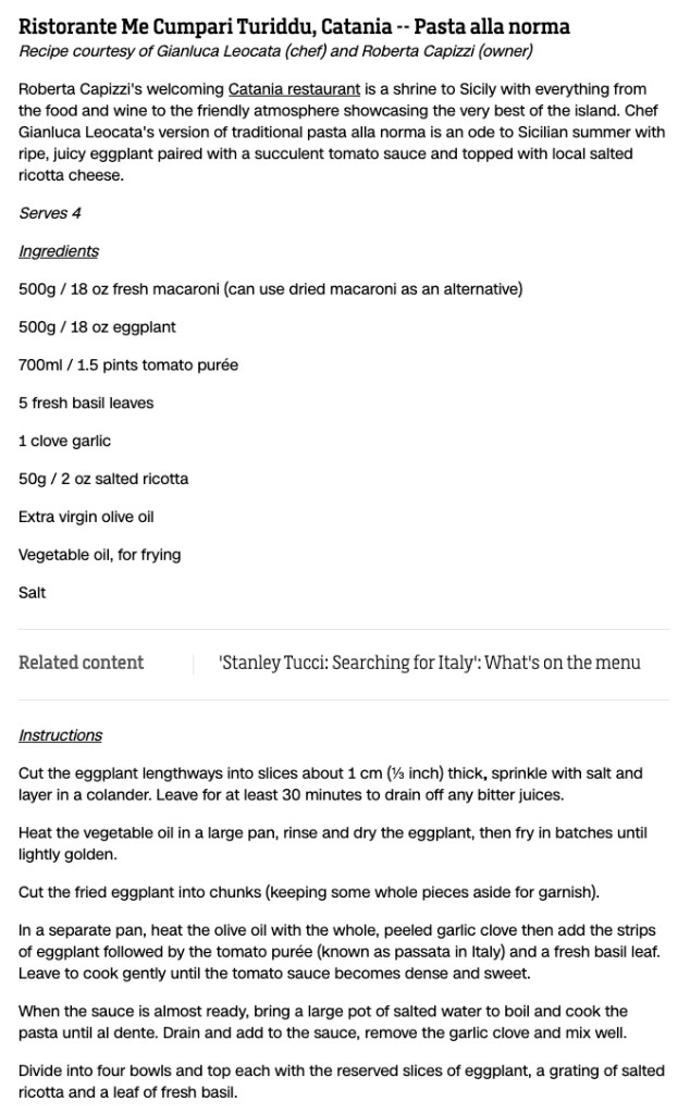 Like many lovers of Italian food, wine, and culture, I enjoyed watching Stanley Tucci’s CNN series recently, “Searching for Italy”. I have also always been a fan of Tucci’s acting and style. In the last episode he visits Sicily. In Catania he goes to Ristorante Me Cumpari Turiddu, and there enjoys one of my favorite dishes, Pasta all Norma.