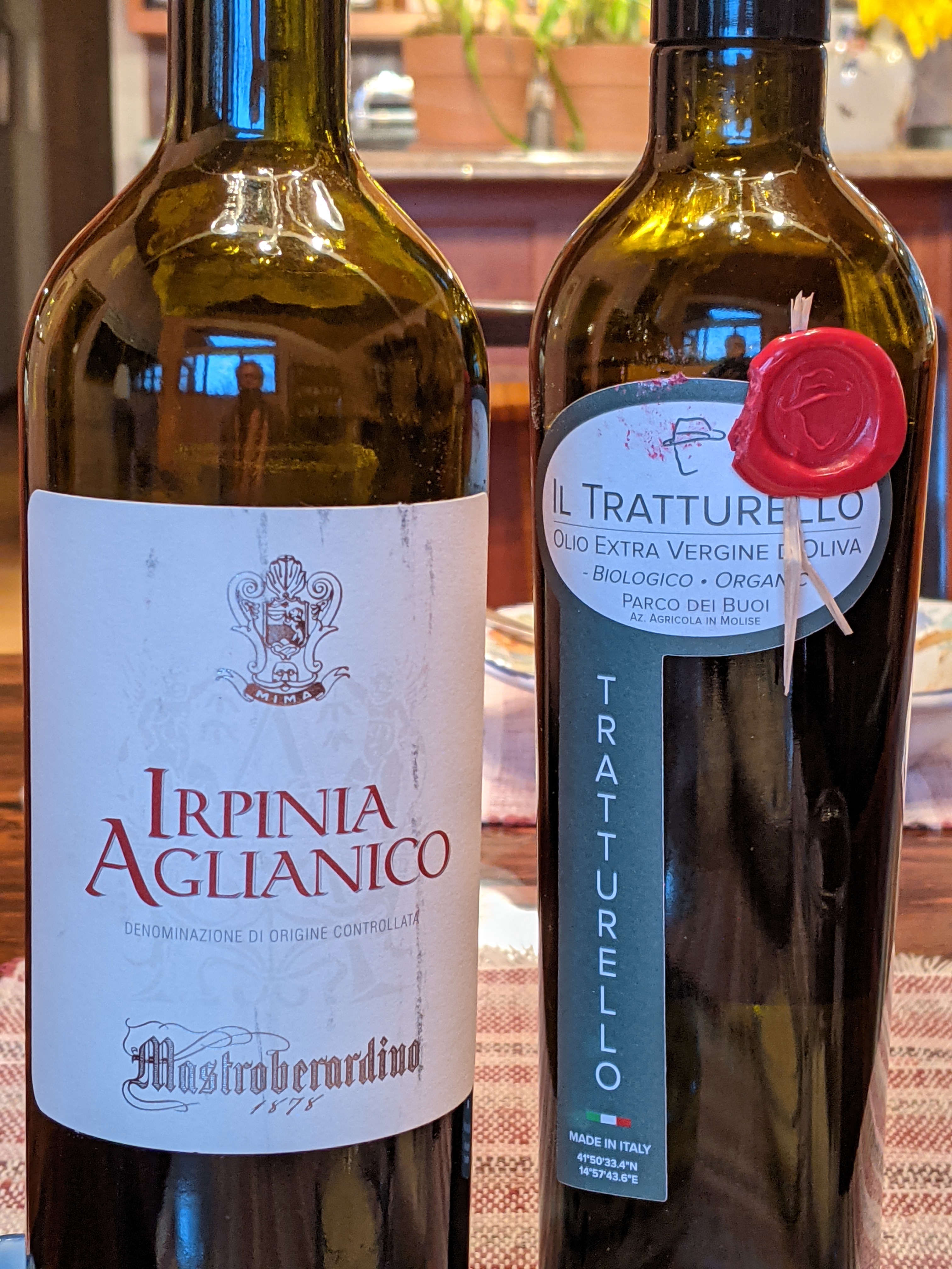 It all came together (vegetables, pasta, pasta cooking water, Barbara’s homemade breadcrumbs, and grated Pecorino) very nicely. Remembering that San Marzano tomatoes are from that region, I chose a Mastroberardino Irpinia Aglianico for the wine. Molto bene!