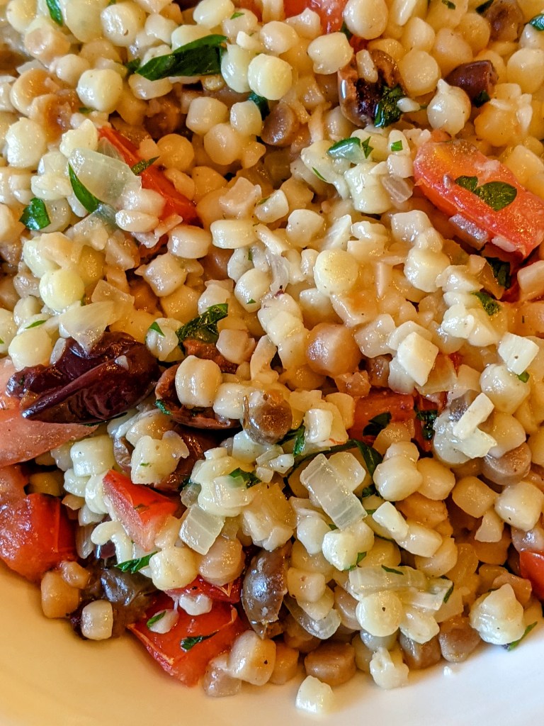 I was in the mood for pasta for lunch; we had Taggiasca olives in the refrigerator; and I recalled a leftover half-package of the dried Fregula from sometime in the last decade, hiding in the bottom of our pasta drawer in the kitchen. The rest was easy, and lunch was good. The Aglianico worked well with this dish, too.