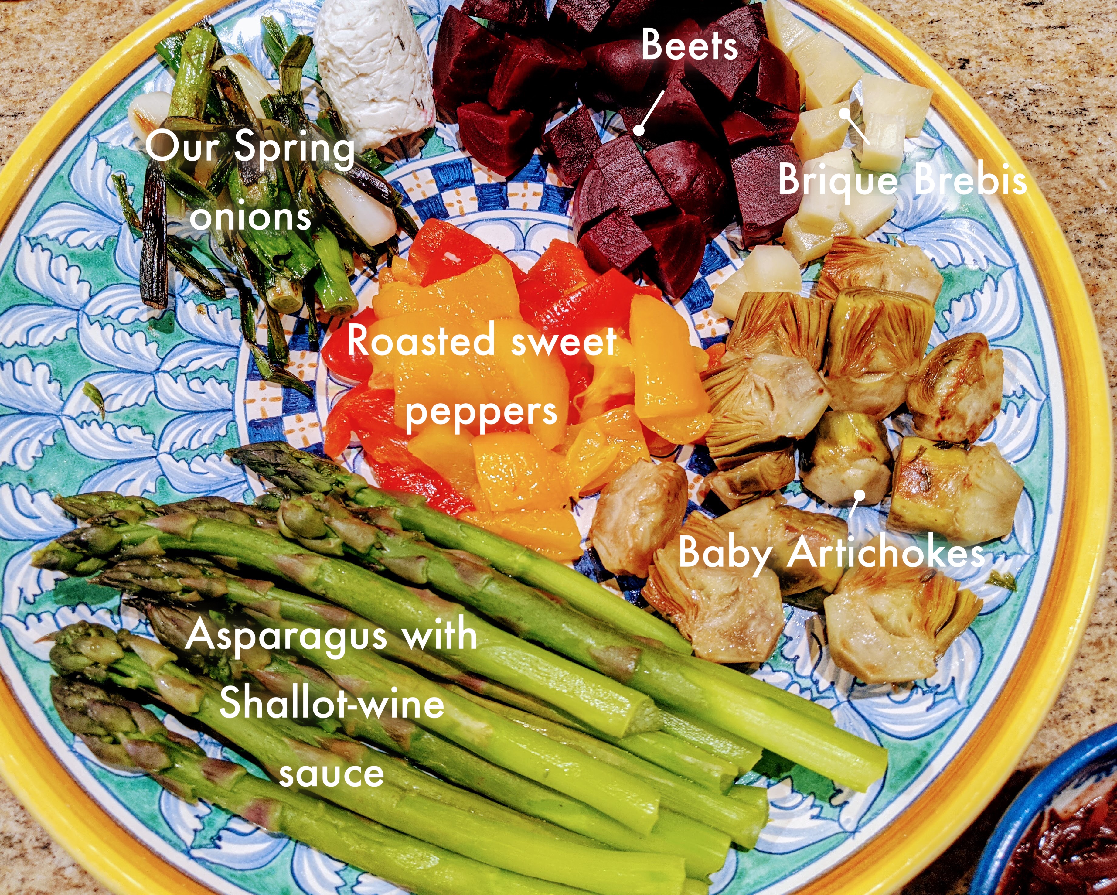 Here is a combination of vegetables and bruschetta, including Halloumi cheese from Cyprus, pipèrade (homemade from a Basque recipe), golden beets heated on the grill, and fresh arugula for counterpoint to the sweetness of the beets.
